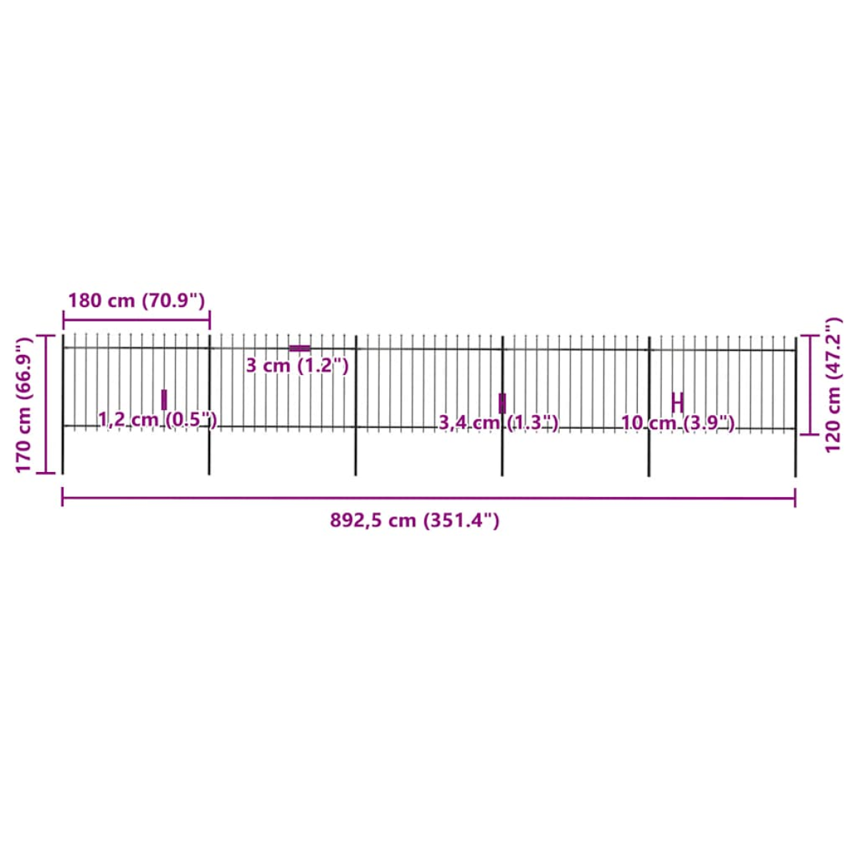 Create an elegant fence around your garden, home, or walkway with our garden fence! Our decorative steel garden fence, consisting of 5 fence panel and 6 posts, has a total length of 8.5 metres. It will form a sturdy, safe and maintenance-free perimeter barrier for your garden, home, or business property. With vertical bars topped with spear ends and strong horizontal brace as reinforcement to the frame, our garden fence will provide a high degree of security. Manufactured from heavy-duty, powder-coated steel, the outdoor fence is exceedingly stable, sturdy and durable. Thanks to the included mounting materials, the garden fence is easy to assemble. Note: You can buy more sets to make the fence as long as you like.