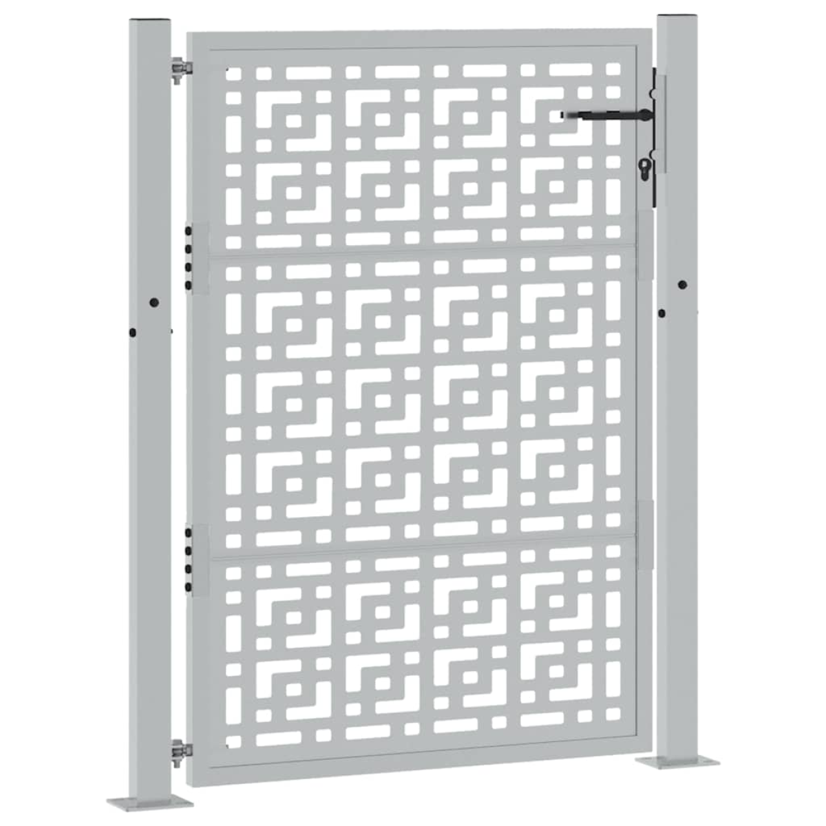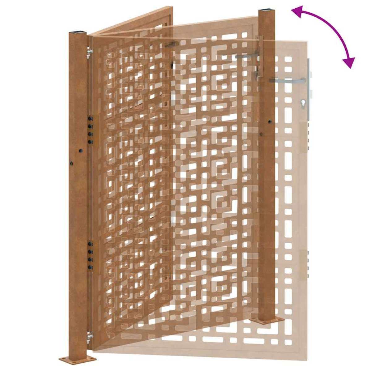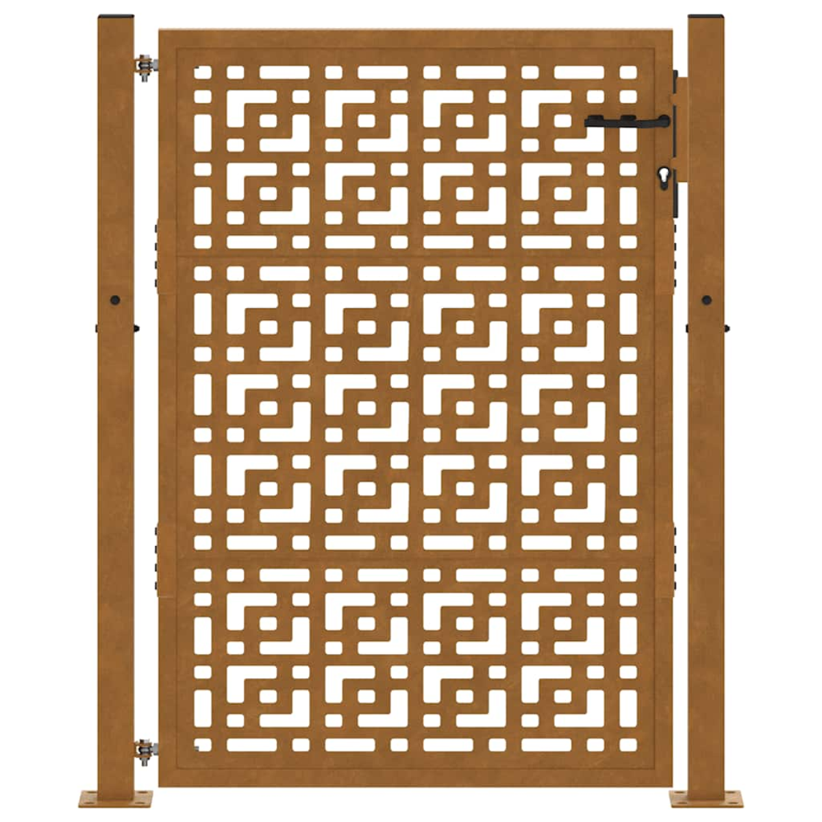 This garden gate, featuring a perfect combination of strength and elegance, makes an ideal entry point for the fence around your garden or patio. Heavy-duty construction: This fence gate is made of weathering steel. Weathering steel is anti-corrosive by its very nature. It develops a rusty protective layer against corrosion when first exposed to atmospheric conditions. Thus, you don't need to paint it. This can help you save on maintenance and repair costs. The distinctive brown colour on the weathering steel will surely be an eye-catcher. Finally, weathering steel is exceptionally durable and will stand up to the test of time.Laser-cut design: The security gate has a beautiful laser-cut design that adds a unique charm to your home.Lockable design: The outdoor gate is equipped with a robust locking system that comes with three matching keys, guaranteeing that the patio gate can be securely locked.Easy to assemble: The entrance gate comes complete with two posts with flange plates and mounting accessories for easy installation.Wide applications: The metal gate is perfect for enhancing garden entrances, driveways, and any property boundaries, combining functionality and visual appeal. Good to know:This product is not rusted yet and has a normal metal colour when you receive it, but rust will develop over time. You could speed up the rusting process by spraying it with soap water and salt water. To keep your clothes stain-free, avoid contact with the developing rust layer.