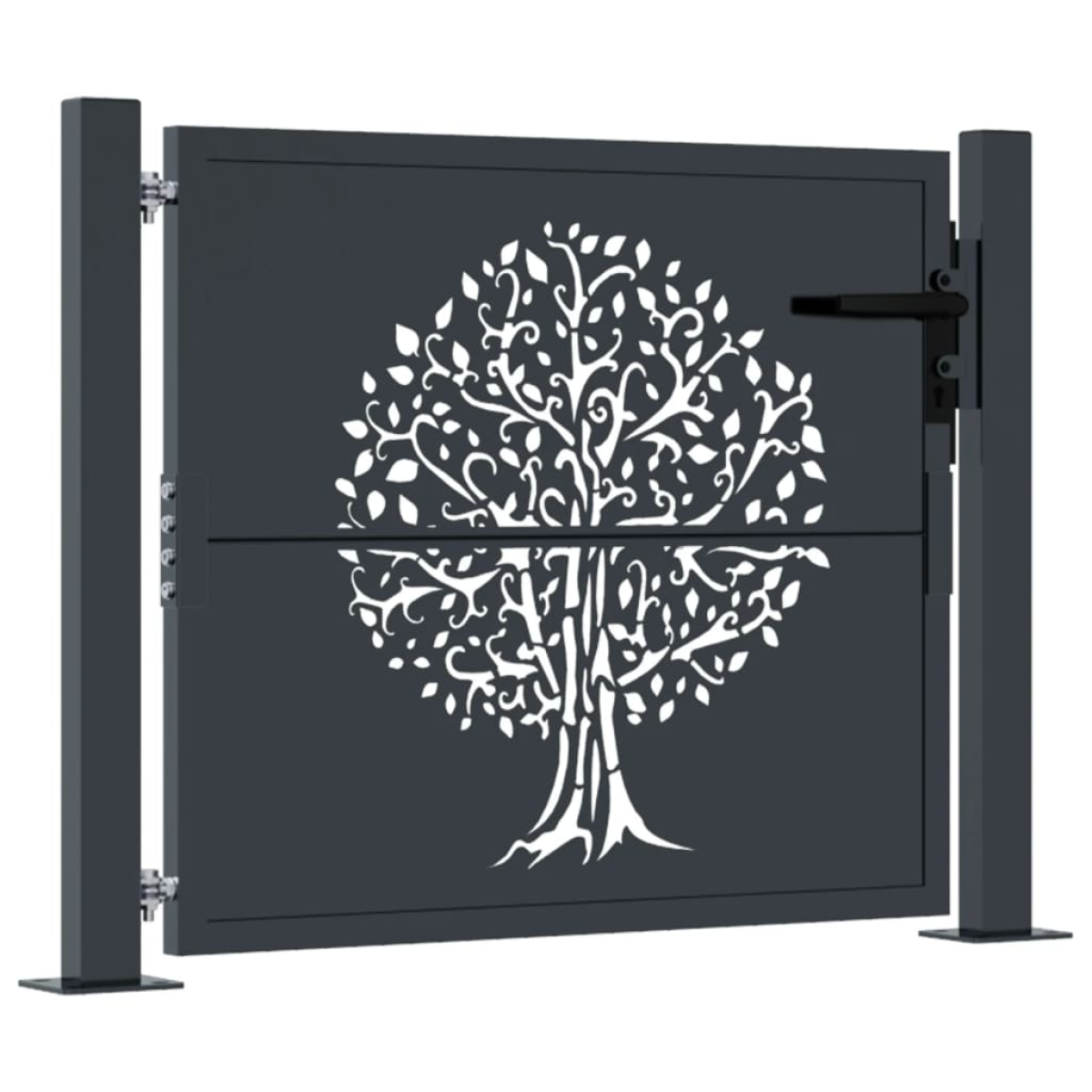 This garden gate, featuring a perfect combination of strength and elegance, makes an ideal entry point for the fence around your garden or patio. Durable material: Steel is an exceptionally hard and strong material. It offers sturdiness and stability. Galvanisation provides better protection against corrosion and is useful for products that'll be used outdoors as well as in harsh environments. And the powder coating on steel creates a protective layer against wear and tear.Laser-cut design: The security gate has a beautiful laser-cut design that adds a unique charm to your home.Lockable system: The outdoor gate is equipped with a lockable system for extra security.Easy to assemble: The entrance gate comes complete with two posts with flange plates and mounting accessories for easy installation.