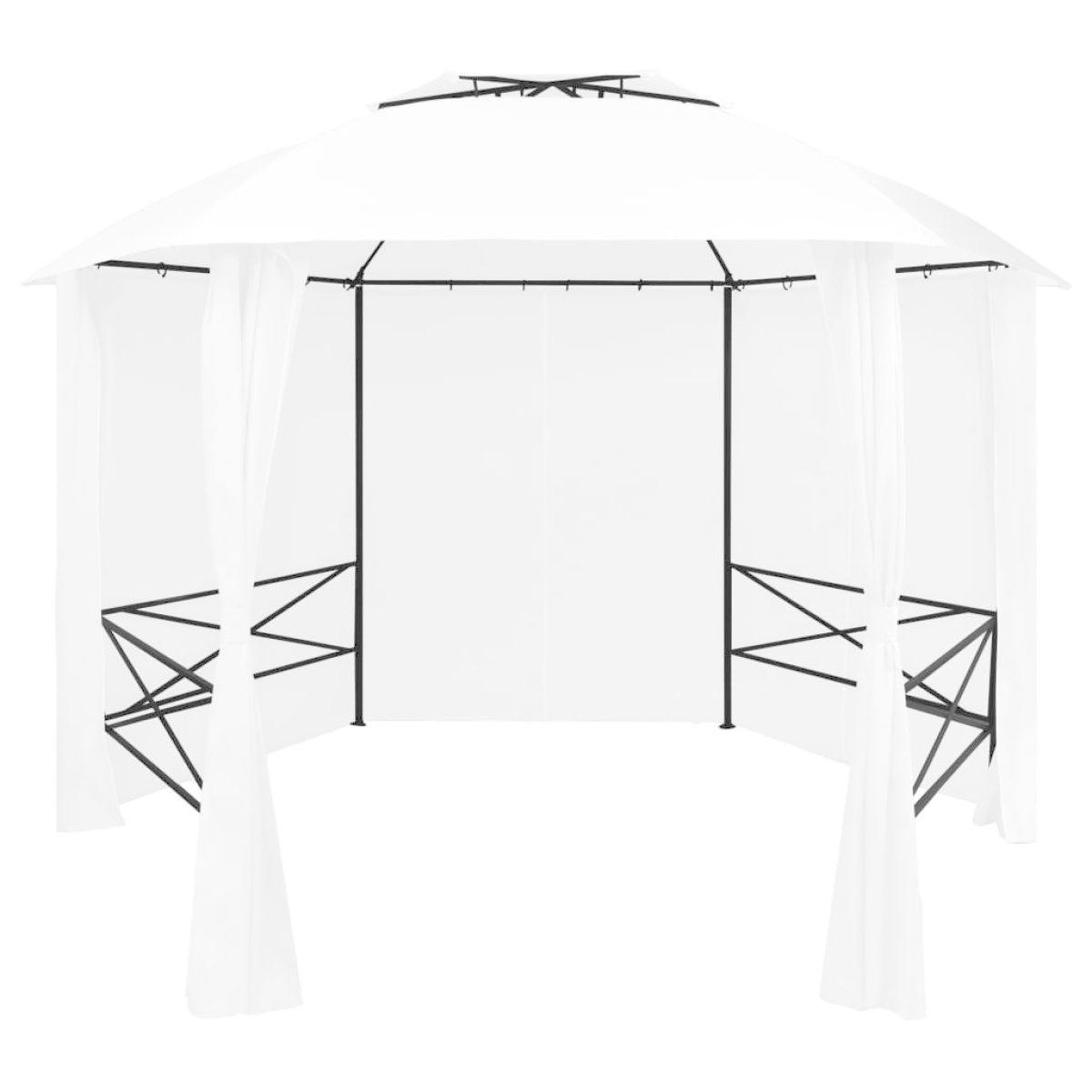 This garden marquee with curtains features a classic and graceful design. It will make the perfect sunshade retreat for outdoor events, such as dinners, BBQs, family gatherings, and so on. The roof and curtains are made of polyester fabric with PA coating. The frame is solidly constructed from strong powder-coated steel, and therefore it is resistant to rust and considered stable. The canopy features a stylish double-vented design that allows for better ventilation. Additionally, the easy-to-clean polyester curtains can be closed to provide more privacy or kept out of the way with the included tiebacks. This gazebo will definitely be a perfect choice for your garden get-togethers. NOTE: This product should NEVER be used under bad weather, such as strong wind, heavy rain, snow, storm, etc.
