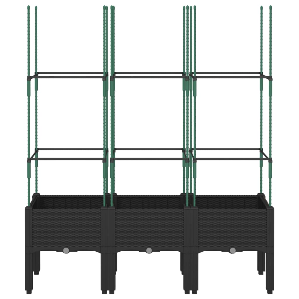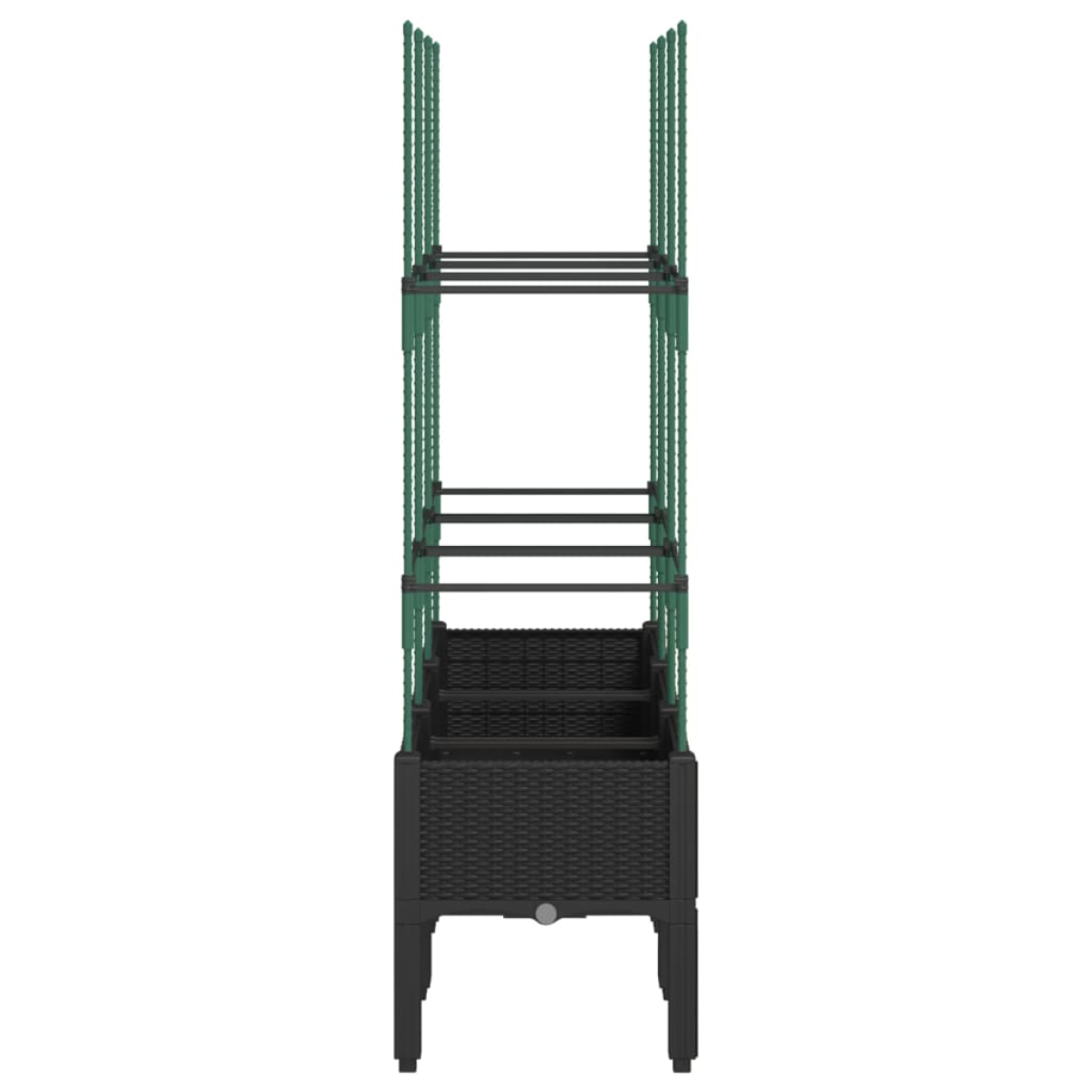This garden planter with trellis is an excellent choice for climbing plants in your garden, patio and terrace. Durable material: Polypropylene is a popular plastic that is also one of the most used materials in outdoor furniture. It's lightweight, tough, and resistant to impact.Generous capacity: The outdoor planter provides plenty of space for growing all your vegetables, flowers and other plants.Practical design: The ideal bottom layer helps retain moisture and allows for easy drainage. Additionally, the integrated trellis offers great support for growing climbing plants such as tomatoes, peas, and roses.Beautiful rattan look: The patio planter is designed with a rattan look, bringing an elegant charm to your living space.Elevated design: The elevated design of this planter box can protect your plants from weeds and pests.