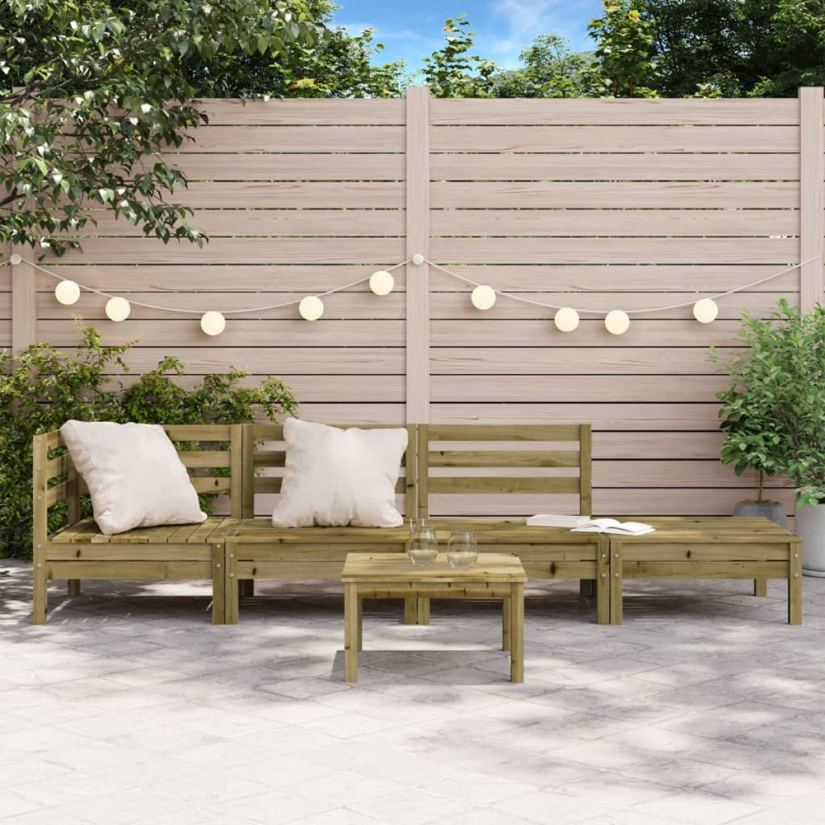 This 4-seater wooden garden sofa will make a great addition to your garden, terrace, or patio for chatting with family and friends or just enjoying the weather. Impregnated wood: Solid pine wood is a beautiful natural material. Pine wood has a straight grain, and the knots give the material its signature, rustic look. Impregnation is a preservation process that is carried out by using autoclaves. The pressure-treatment increases resistance to decay and weather.Comfortable seat experience: The backrest adds extra seating comfort for the garden seating.Slatted design: The slatted design of the pallet sofa effectively prevents water from pooling, ensuring that the seat remains dry and free from potential rot.Modular design: The wooden garden sofa features a modular design, making it completely flexible and easy to move around to suit any setting. You can combine it with other modular segments available in the drop-down menu to create your own personal garden lounge set configurations! Good to know:To make sure your outdoor furniture stays beautiful, we recommend protecting it with a waterproof cover.