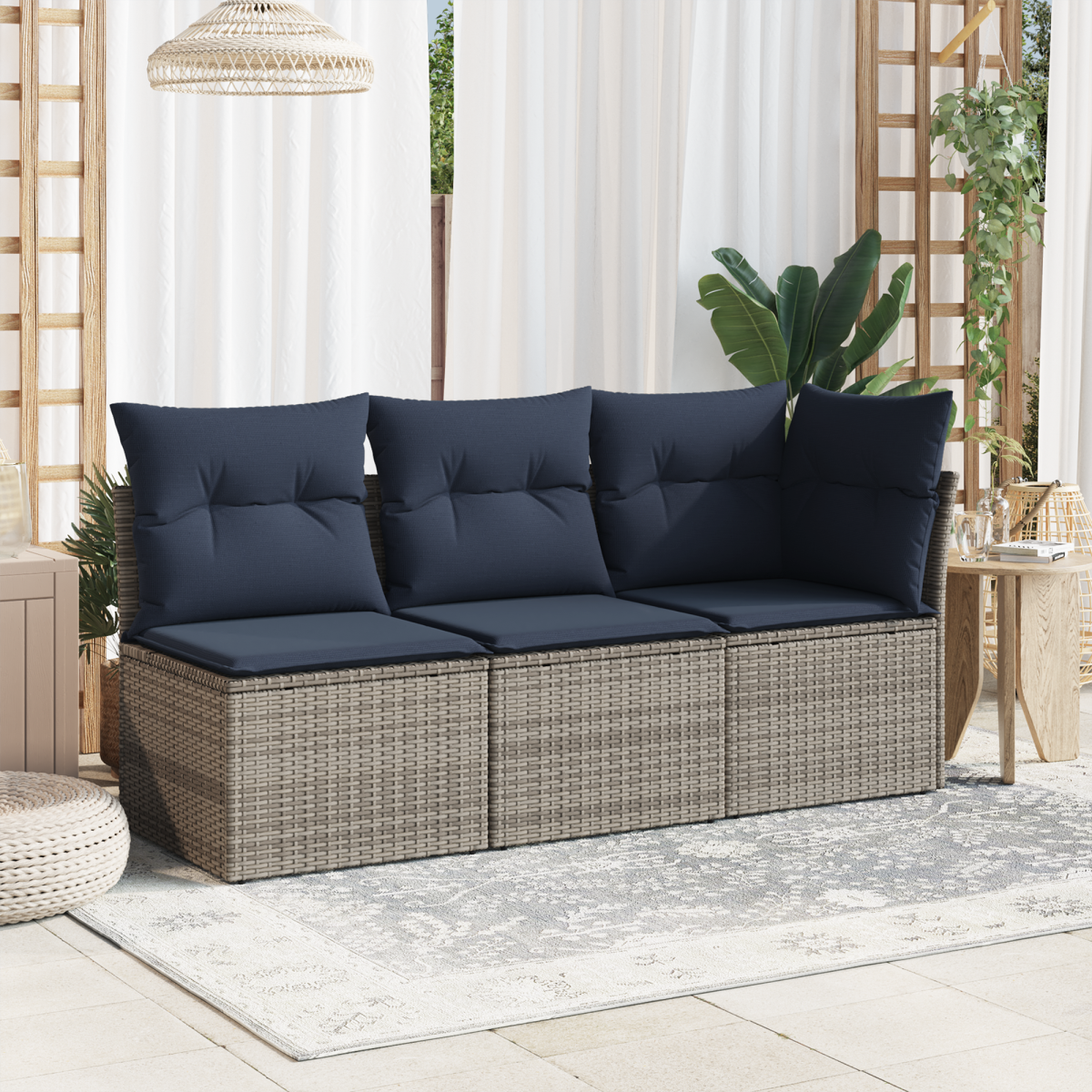 This Garden Sofa with Cushions is all about bringing modern outdoor seating to life with its brilliant mix of style, comfort, and toughness. It adds a touch of elegance to your garden or terrace with its fancy woven texture and clean lines, which really upgrade any space. It’s just right for lounging around in the spring and summer, fitting in perfectly with all kinds of outdoor settings, giving you a spacious spot to chill, socialise, or kick back in the peace of your own backyard. Materials: Made from top-notch poly rattan, this sofa has a woven texture that brings a bit of character and modern flair to your outdoor area. The sturdy material is also UV-resistant, so it won't fade or get damaged by the sun, keeping it looking sharp for ages. Included Components: The sofa has a tough powder-coated steel frame for solid support and longevity. The cushions are removable and come with zippers, making them easy to clean and swap out when needed. Features / Function / Design: Its modular design lets you move and rearrange the sofa pieces however you fancy, so you can set it up to fit any outdoor space or gathering perfectly, ensuring everyone is comfy. Recommended Uses: Ideal for terraces, gardens, and any outdoor relaxation spots, this sofa is perfect for those who love mixing comfort with style. Great for throwing parties, soaking up the sun, or just having a quiet spot to escape the world. Care & Maintenance: Keeping it looking nice is easy. Throw a cover over the sofa if it’s pouring down rain when you’re not using it. Make sure to bring the cushions inside during bad weather to keep them in good shape.