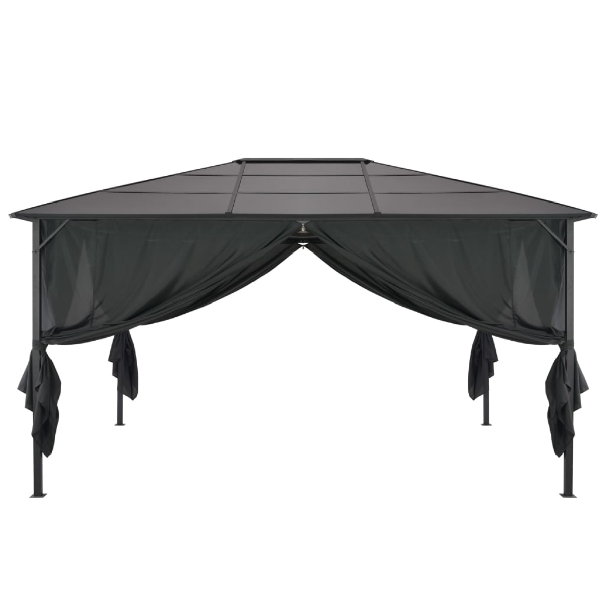 This gazebo with curtains features a classic and elegant design, which will cater the perfect sunshade shelter for outdoor events, such as dinners, BBQs, family gatherings along with other activities. The roof, made of 6 mm thick UV-resistant PC board, guards you from the glare and harmful UV rays of direct sunlight. The gazebo is solidly constructed from strong aluminium and steel, and is consequently resistant to rust and very stable. The pavilion is delivered with 4 sidewalls, which can be drawn in bad weather. Hook and loop fasteners are also included for easy attachment of the curtains. The gazebo can be easily fixed to the ground with the included fixing accessories. The pavilion is easy to assemble. NOTE: This product should NEVER be used under bad weather, such as strong wind, heavy rain, snow, storm, etc.