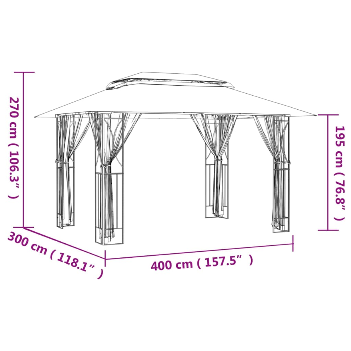 - Overall dimensions: 400 x 300 x 270 cm (L x W x H)