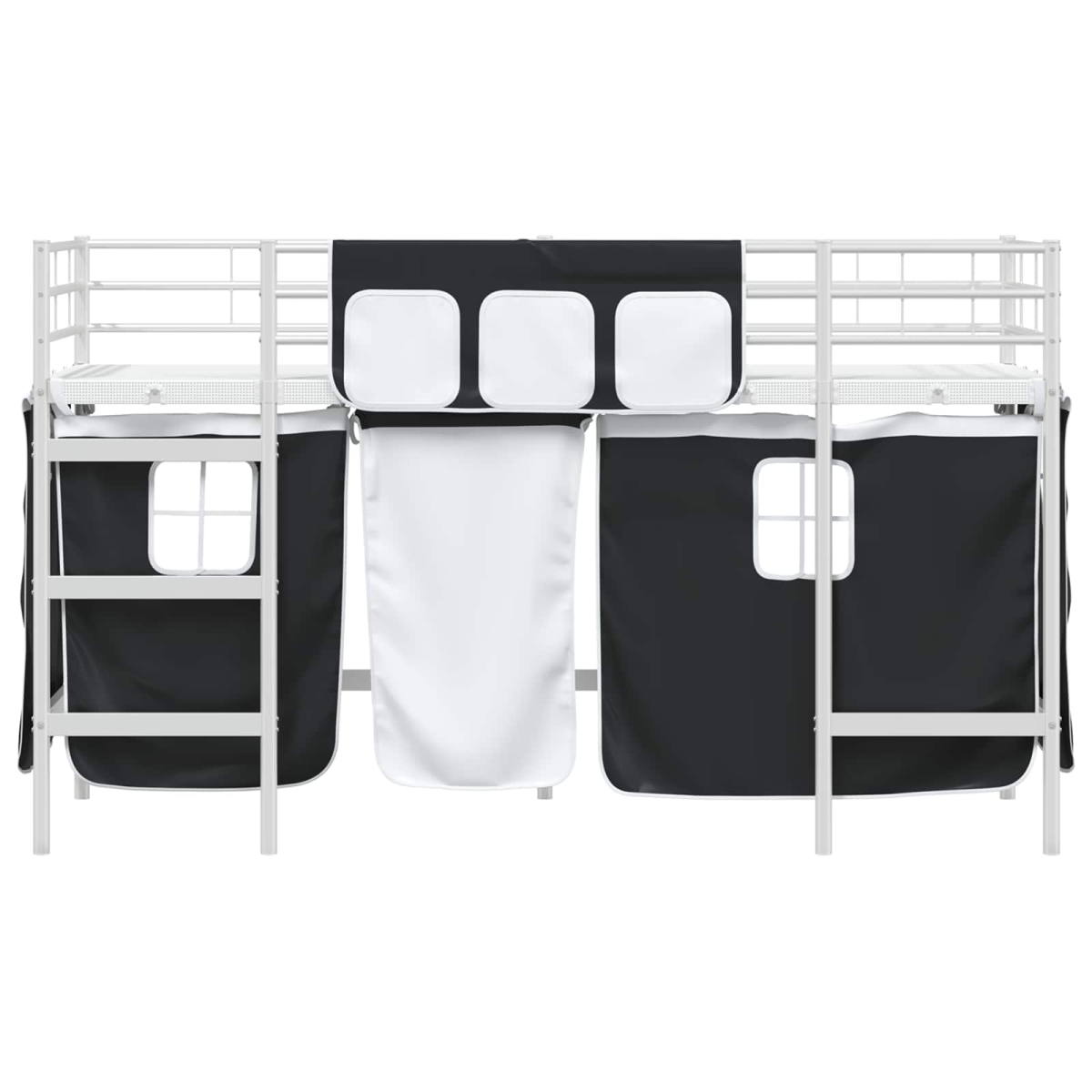 This Kids'Loft Bed Frame with Curtains is designed to transform any child's room into a modern, functional space. Raising your little one's sleeping area above the ground, it frees up valuable space for play and creativity. The bed’s metallic frame and streamlined design offer a sophisticated yet child-friendly aesthetic, while the addition of curtains turns the lower area into a private fort or play zone. Ideal for children who love naps and adventures, this loft bed not only adds an adventurous touch to their room but also makes organizing easy by maximizing floor area usage. Robust Metal Frame: Crafted entirely from metal, the bed frame delivers uncompromised strength and reliability. The powder-coated finish adds a touch of elegance and longevity, keeping your child's space looking stylish for years. It’s designed to withstand the bouncing and antics of active little explorers while maintaining its sturdy form and classic smooth texture. Functional Slatted Base: The fixed slatted frame provides durable support for mattresses, offering children a comfortable sleep without compromising safety. This configuration ensures that the mattress rests securely, enhancing sleep quality by increasing stability and helping air circulation for a breathable sleeping environment. Privacy with Style: Featuring curtains made from breathable mesh, the integrated grommet-style draping system allows for easy opening and closing, giving your child a sense of privacy or imaginative space. These sleek, black curtains mount elegantly within the frame, transforming the area underneath into a perfect hideaway for reading or pretend play. Modern Look: Its minimalist charm is accentuated by the rectangular design and careful selection of materials. Ideal for fitting into modern-style bedrooms, it utilizes shapes and colors that meld versatility with contemporary aesthetics, complementing various decor themes effortlessly. Easy Care Instructions: Maintaining this bed frame is convenient with simple care instructions—wipe clean with a damp cloth to keep it free from dust and scuffs. Follow the assembly guidance precisely to ensure the optimum setup and safety for your little ones.