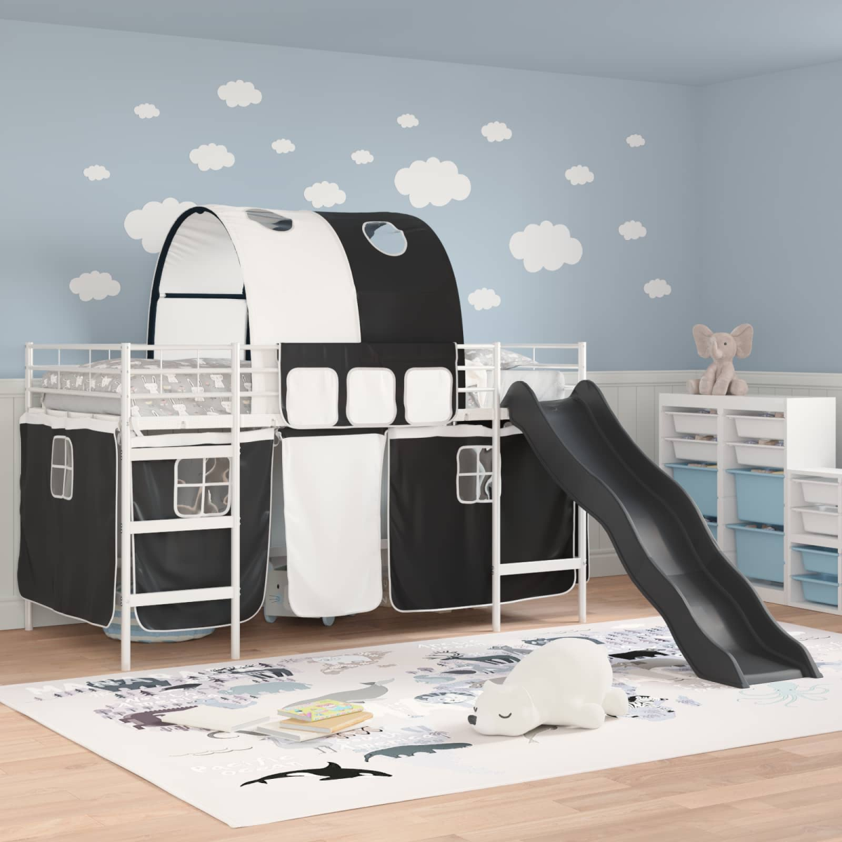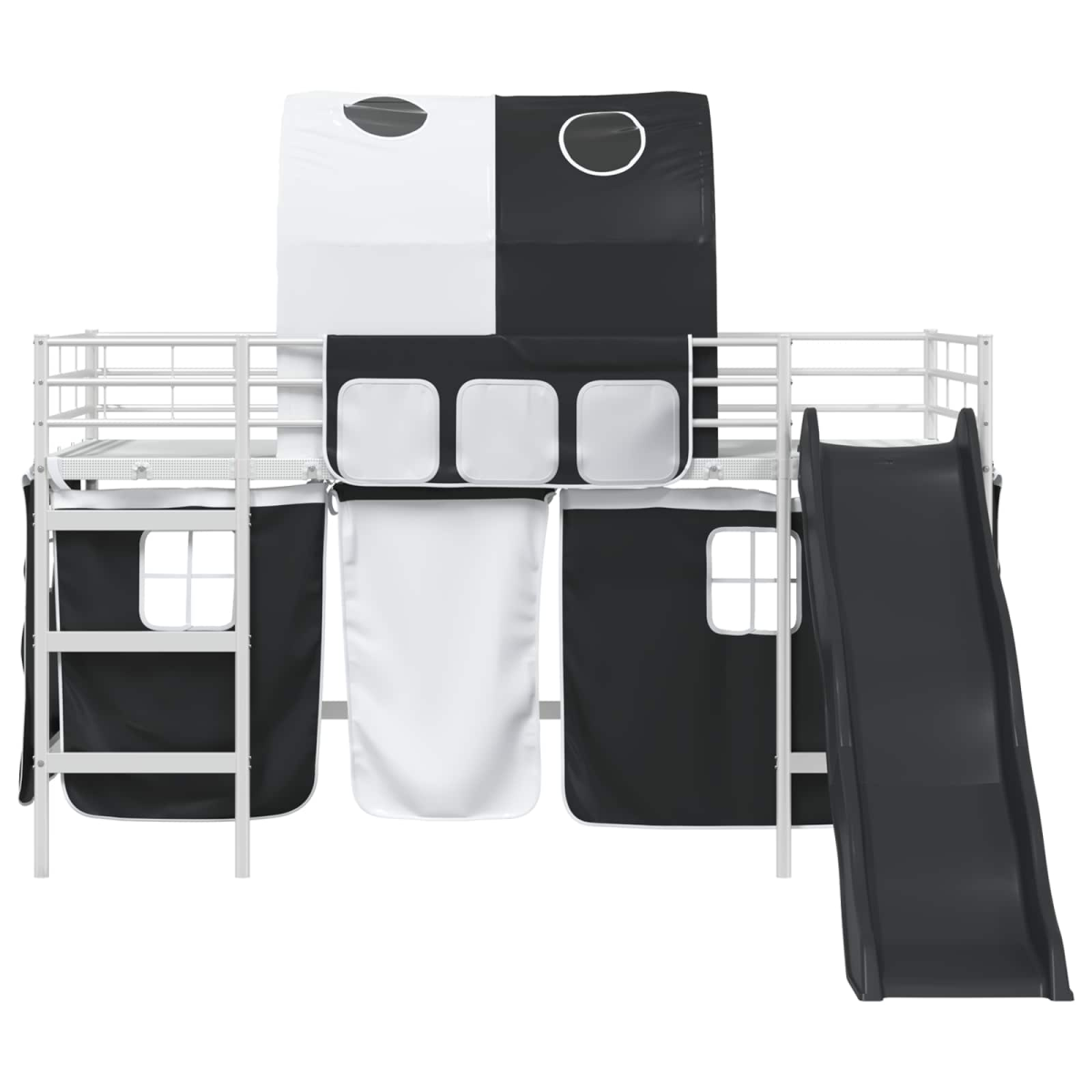 The Kids'Loft Bed Frame with Curtains, Arch, and Slide is designed to combine fun with functionality, creating a delightful sleep space that young ones will love. Crafted for modern homes, this rectangular bunk bed frame features a sleek and stylish aesthetic that seamlessly fits into any bedroom or children's room. The use of durable materials, coupled with a playful slide and customizable drapes, provides an engaging environment for both rest and play. Its black and blue color scheme adds a cool and contemporary vibe to any living space, making it both a practical and exciting addition to the household. Robust Materials: This loft bed is crafted from steel, providing a strong and stable structure that supports the lofted sleeping area safely. The use of metal ensures a durable frame that withstands the energetic activities of children. Included Components: Equipped with manual curtains for added privacy, this bed features a platform slatted frame that offers ample support for the mattress. The mesh curtains, complemented by a unique archway design, allow for fun and creative interactions. Child-Centric Features: This bed includes a slide for playful moments, which engages children and promotes an active imagination. The headboard is metal, mounted to the wall, enhancing space efficiency and providing a streamlined look. Versatile Uses: Designed for indoor use, this bed is ideal for children's rooms, with its modern style fitting a variety of contemporary themes. Whether used for sleeping, play, or study, it adapts to every child's needs. Care &Maintenance: Easy to maintain, the metal parts of the frame should be cleaned with a damp cloth, then dried to preserve its matte finish. Avoid harsh chemicals to keep the bed looking pristine for years.