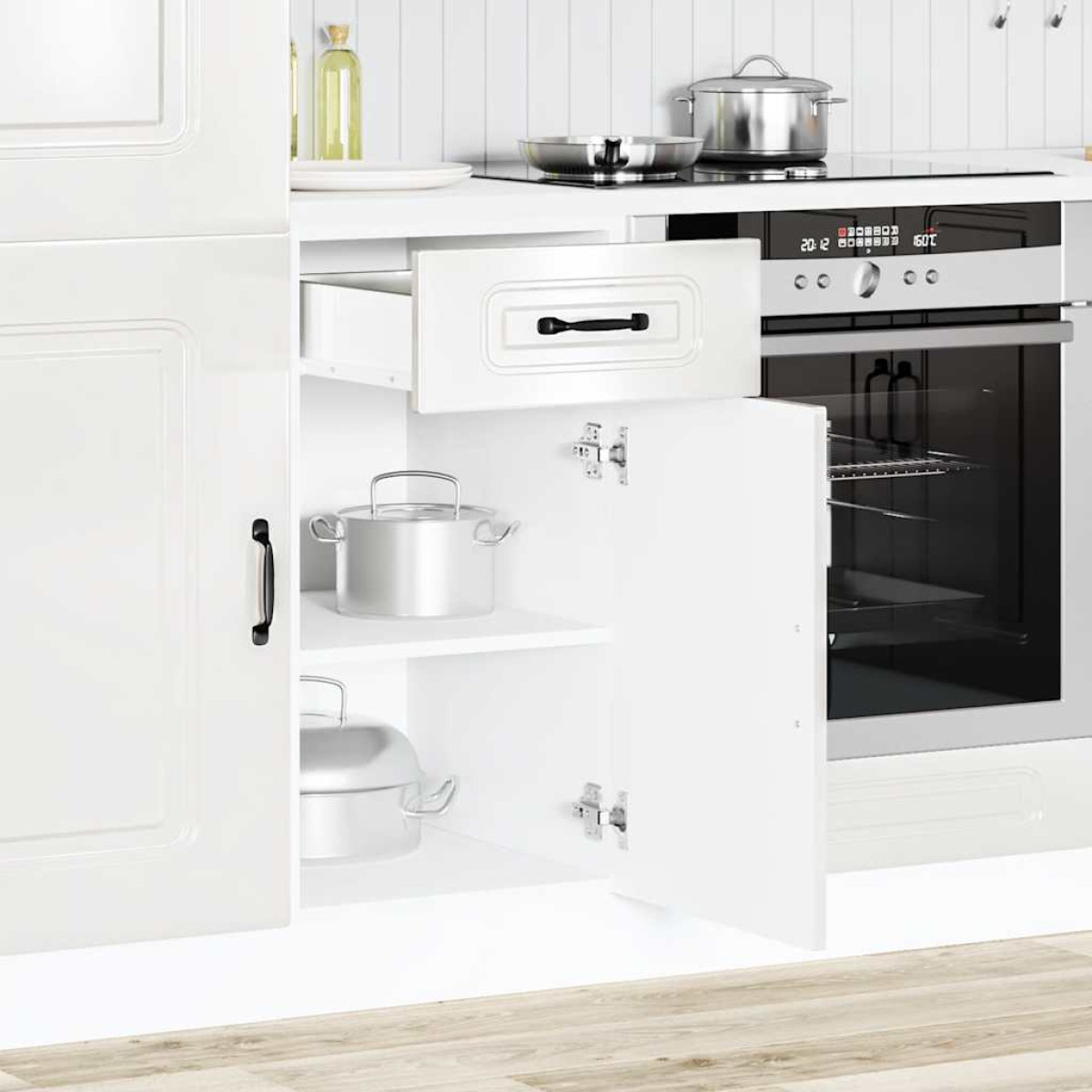 This kitchen base cabinet optimises your kitchen space, providing ample storage space for your personal belongings! Stable and durable material: Engineered wood is a durable and stable material with a smooth surface that is resistant to moisture, warping, and splitting, making it a reliable choice for a variety of projects.Ample storage space: The kitchen base cabinet offers sufficient space to store bowls, plates, pots, and other kitchen appliances.Practical door: The door helps maintain a clean and organised space by concealing kitchen appliances and clutter behind them.Adjustable feet: The feet of this cabinet can be adjusted in height to suit your kitchen layout.Easy to maintain: Thanks to its smooth surface, this kitchen base cabinet is easy to clean with a damp cloth and requires less maintenance. Warning:To prevent it from tipping over, this product must be used with the provided wall attachment device. Good to know:Screw(s) and plug(s) for inside the wall are not included. Seek and use screw(s) and plug(s) suitable for your walls. If you are uncertain, seek professional advice. Read and follow each step of the instruction carefully.