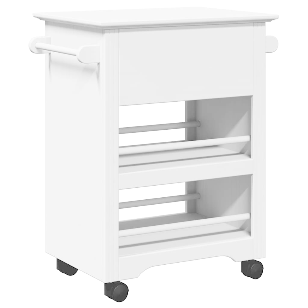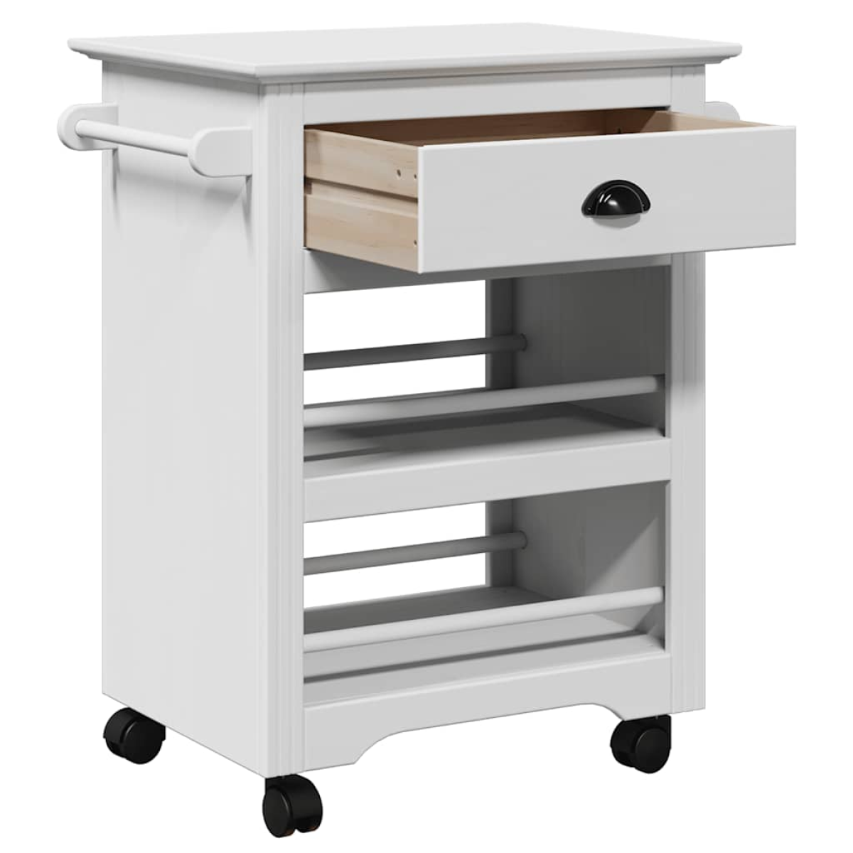This kitchen trolley is meant to be a decorative and practical addition to your home. Durable material: Solid pinewood is known for its strength and durability. Its straight grains and distinctive knots contribute to its rustic charm. Engineered wood is a durable and stable material with a smooth surface that is resistant to moisture, warping, and splitting, making it a reliable choice for a variety of projects.Ample storage space: The kitchen storage trolley provides ample storage space for keeping your various daily essentials well organised and within easy reach.Easy to move: This trolley, with the included four swivel wheels, can be easily moved to the desired place.Easy to use: The metal handle of the drawer make it convenient to open and close and make the serving trolley more attractive.Easy to maintain: Thanks to its smooth surface, the organiser trolley is easy to clean and only needs a wipe with a dry cloth. Good to know:Screws and plugs for inside the wall are not included. We advise to find and use screws and plugs suitable specifically for your walls. If you're not sure, you can consult with a professional. Please read and follow each step of the instructions.