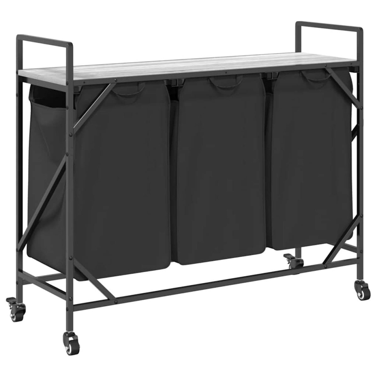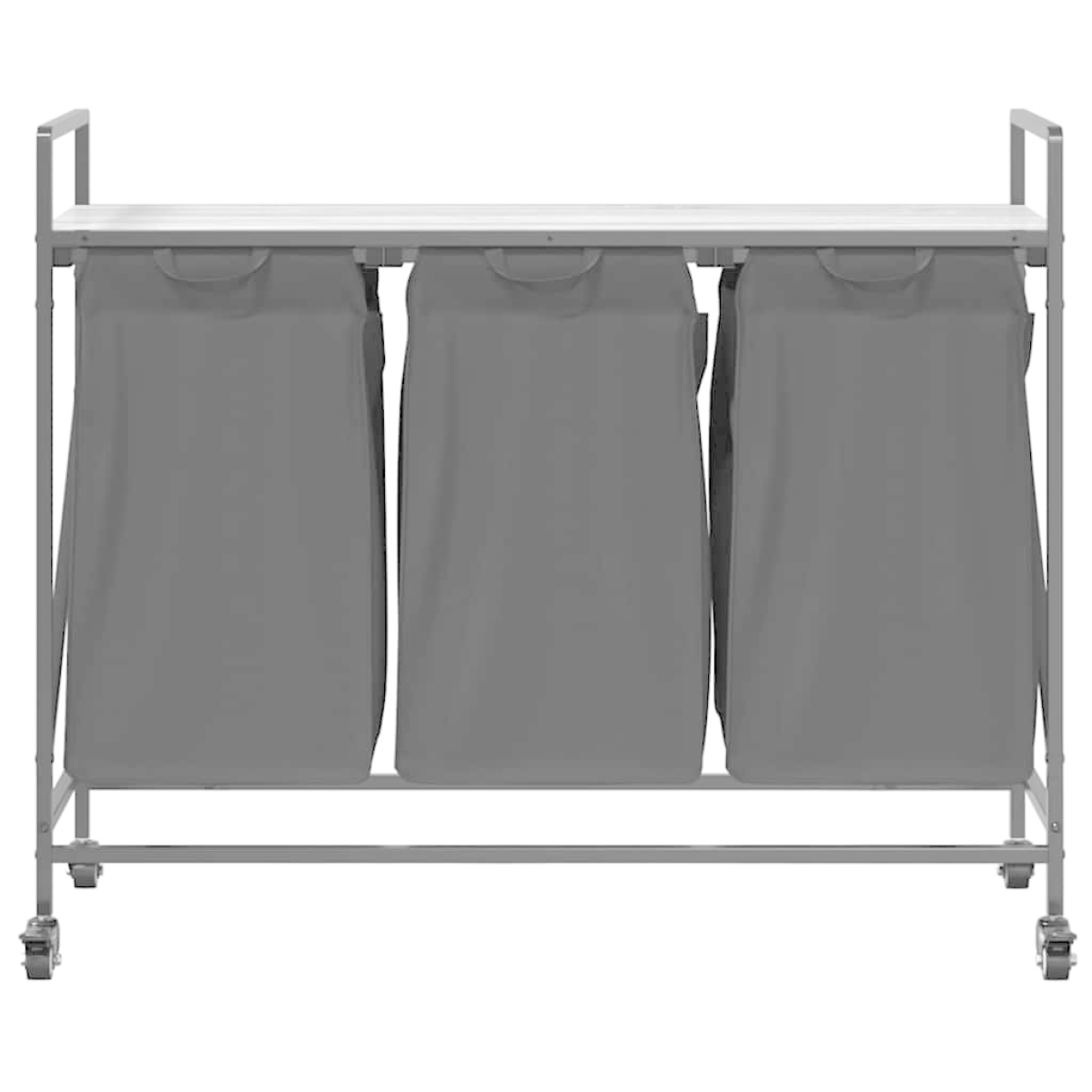 The laundry basket provides a spacious and convenient storage solution, featuring pull-out bags and wheels that make organising and transporting your laundry effortless. Laundry sorter: Designed to offer a generous load of laundry per bag, this organiser helps categorise garments by colour or fabric type, maintaining a clutter-free laundry area, and also storing toys and more.Convenient pull-out laundry bags: The removable laundry bags are designed with pull-out handles and hook-and-loop fasteners for easy detachment and pulling. The reinforced bottom panels help maintain the bags' shape and prevent sagging.Robust and durable structure: This laundry basket combines a steel frame with durable engineered wood, offering excellent strength, wear resistance, and stability.Top storage surface: The laundry basket features a top shelf, offering a practical solution for keeping your essentials within easy reach. Perfect for storing toiletries, laundry detergents, fabric softeners, or even decorative items.Effortless mobility: Featuring durable wheels for easy movement, this laundry basket allows you to smoothly roll it from room to room. Two of the wheels are equipped with brakes, ensuring that once you've placed the basket where you need it, it stays securely in place without rolling away.
