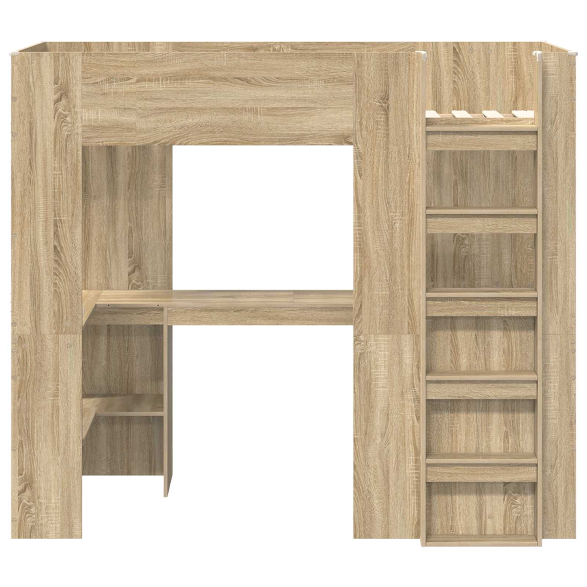 The Modern Loft Bed Frame with Desk is an ideal space-saving solution that combines functionality and contemporary style for any bedroom setting. This single bed frame offers a sleek appearance with its clean lines and minimal ornamentation. Perfect for students or small rooms, it features a desk for studying or work, seamlessly integrating sleeping and productivity zones in one compact unit. Materials: This bed frame is made from engineered wood, specifically chosen for its robust nature and smooth finish, providing both aesthetic appeal and functionality. Engineered wood contributes to the stability and strength of the frame, ensuring it meets the everyday demands of a busy household and maintains its quality throughout years of use. Included Components: Featuring a functional desk and shelves, this loft bed frame is designed to provide dedicated space for studying or work. The desk can accommodate a laptop, books, and other study materials, while the shelves offer additional storage for personal items, providing a tidy and organized area in any bedroom. Practical Design: The bed includes slats for mattress support and a safety guardrail to ensure a secure sleep environment. Its modern design, characterized by simplicity and minimalism, fits well in rooms with similar decor. The easy-climbing ladder makes access to the upper bed safe and convenient for everyday use. Recommended Uses: Ideal for small bedrooms, dorm rooms, or teen spaces where maximizing space is essential. It serves not only as a sleeping area but also as a study zone, making it suitable for students or anyone with limited space. Care &Maintenance: For optimal maintenance, it is recommended to wipe the frame with a dry cloth to remove dust. Regular checking of screws and fittings helps ensure the frame's integrity over time, contributing to the longevity of its use.