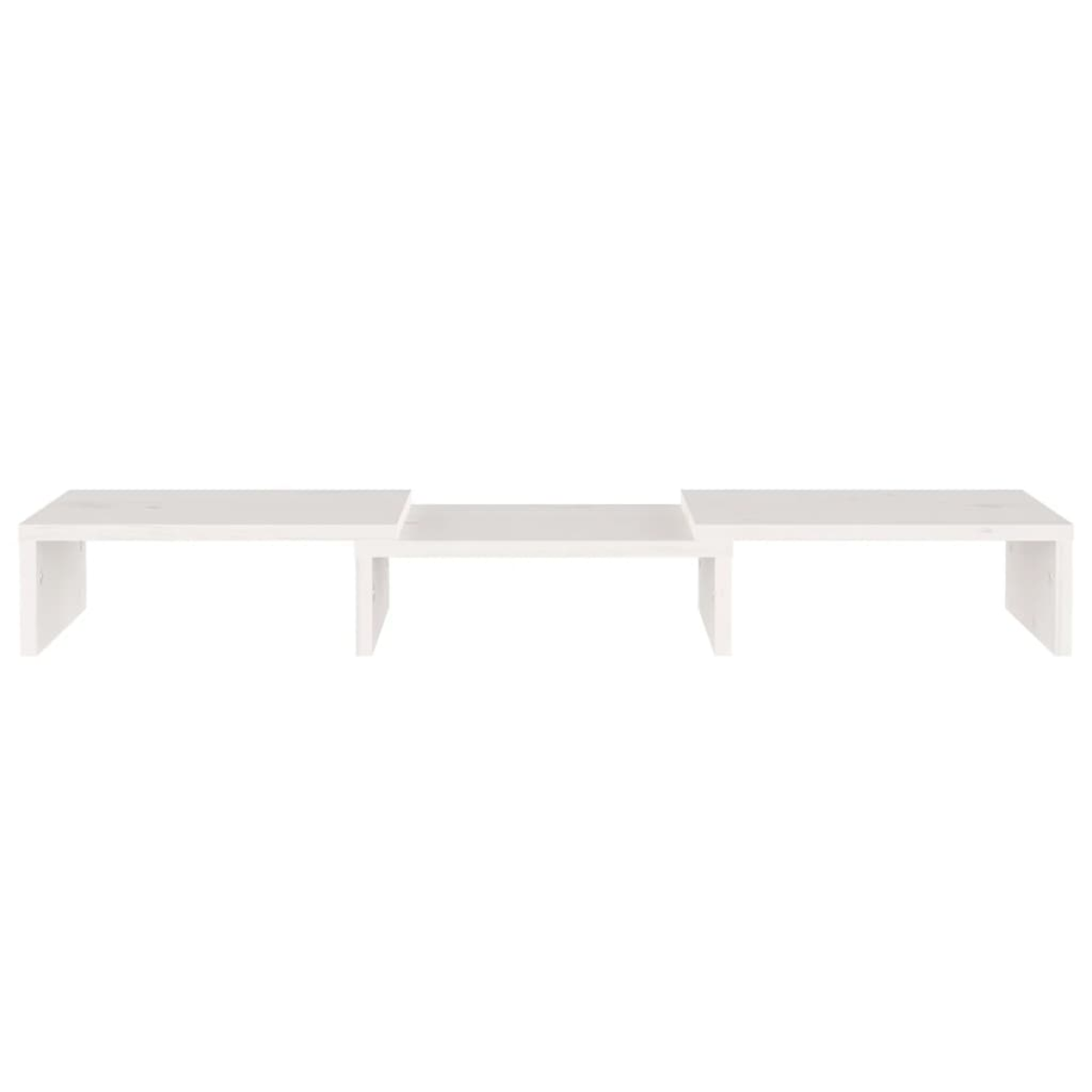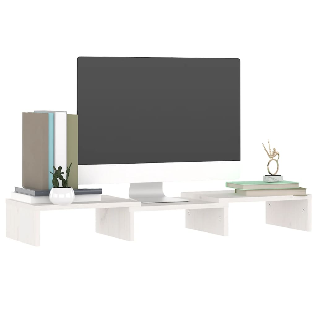 You can now raise your monitors higher with this wooden monitor stand. The sleek design makes it a practical and decorative addition to your working area. Premium material: Solid pine wood is a beautiful natural material. Pine wood has a straight grain, and the knots give the material its signature, rustic look.Storage function: This monitor riser can accommodate your keyboard, DVD player, gaming console, streaming device, receivers, media carriers, notebooks, pens, and similar items.Stress-reducing function: This wooden monitor stand can be used as a riser for your desktop monitor and other multimedia devices. Raising your screen will reduce the strain on your neck and back.Adjustable length: The length and two side shelves of the monitor stand can be adjusted and rotated to different needs, creating a spacious and tidy workplace.