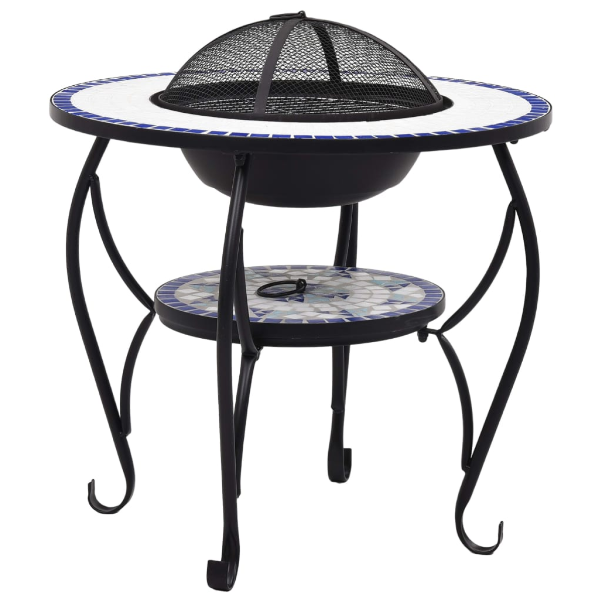 This fire pit will make a decorative and atmospheric addition to your garden or patio decor, while also keeping you warm when it gets colder in the evening. Made of steel, the fire pit bowl is excellent in absorbing and radiating heat. It can be used to burn dry wood, logs or charcoal. The fire pit is supported by a four-leg stand. The included safety mesh allows you to watch the burning fire, and encloses the fire for safety as well as preventing sparks and debris flying out. The poker tool can be used for both removing the mesh cover and rearranging the logs or coal. Additionally, the fire pit table can also be used as a barbecue. Its round ceramic surface offers a perfect place for drinks and roasting supplies. Please note this product is not suitable to be left outside in cold condition.