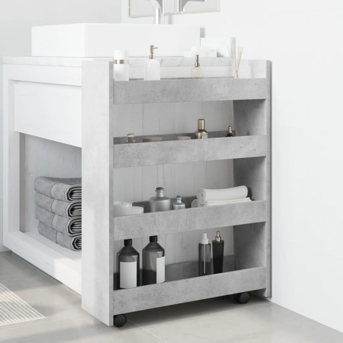 BuytoGive | Product | vidaXL Narrow Storage Trolley 4 Tier Concrete Grey Engineered Wood