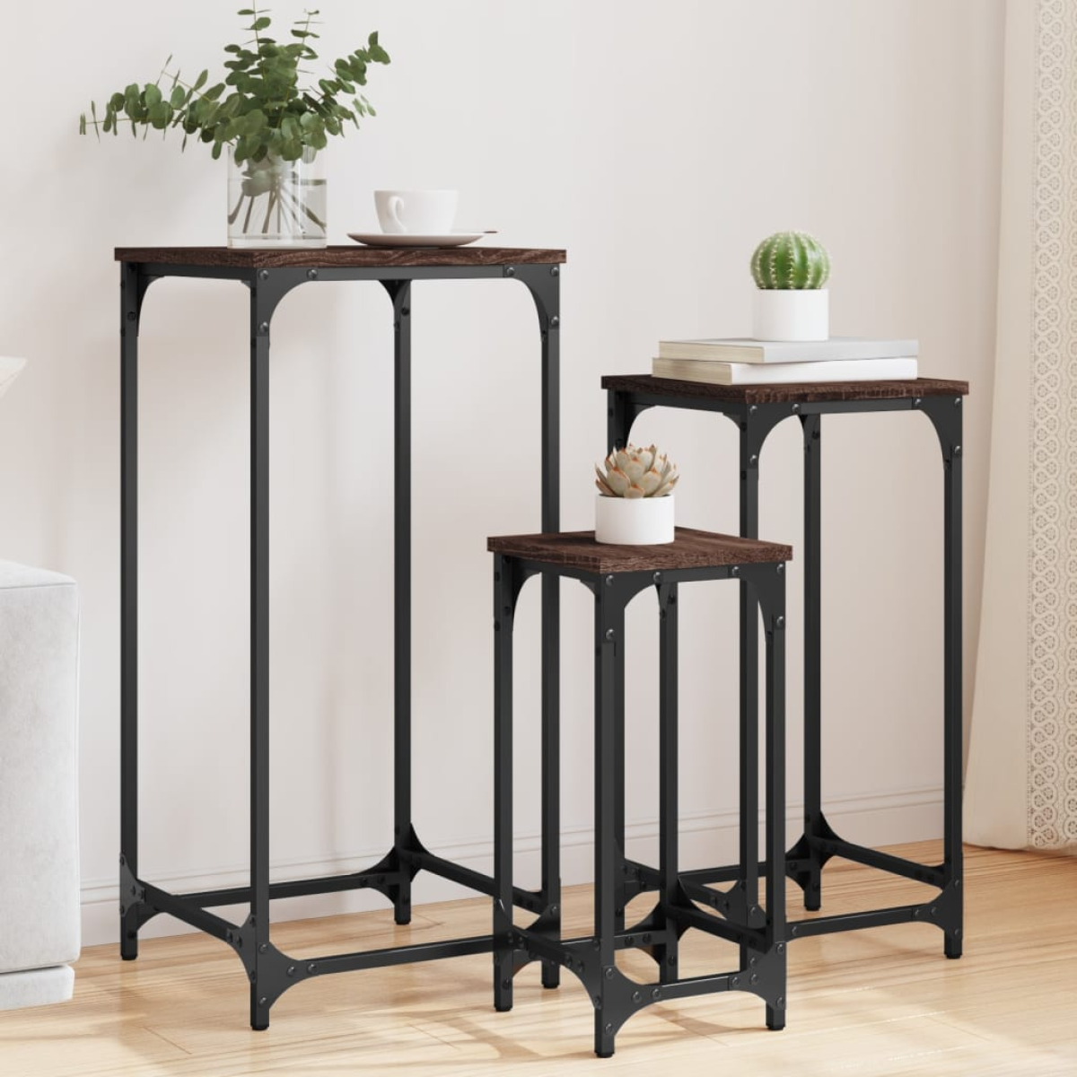 These three nesting side tables are a smart solution for small living spaces or any area with limited room. With an industrial design, this side table set adds a chic touch to your living room, bedroom, or office. Durable material: The engineered wood is of exceptional quality with smooth surface and also features strength, stability and resistance to moisture. Made of engineered wood, these nesting tables are easy to clean.Nesting design: The nest of tables has different sizes to meet your different requirements. The smaller table can nest inside the larger side table if you need more room.Sturdy top: The sturdy tabletop of the nesting stand is ideal for placing your drinks or any other necessities you need close at hand.Versatile function: The nesting tables are versatile! Any one of them can be used as a nightstand in the bedroom or a couch table in the living room and office.Metal frame: The metal frame adds an industrial style to your interior while ensuring durability and stability. Warning:To prevent it being overturned, this product must be used with the provided wall attachment device.