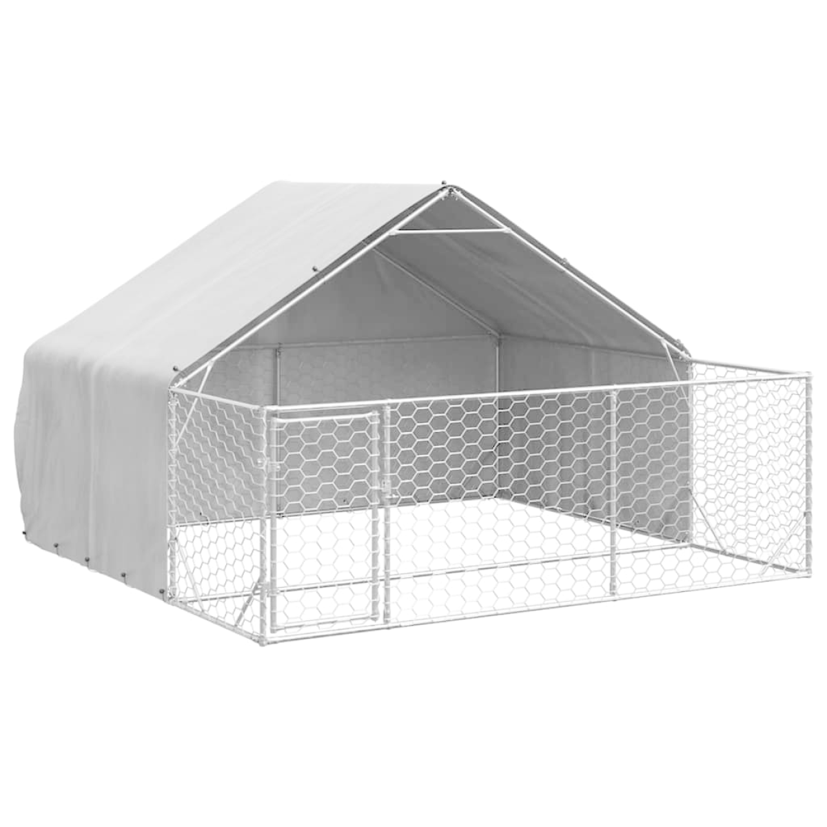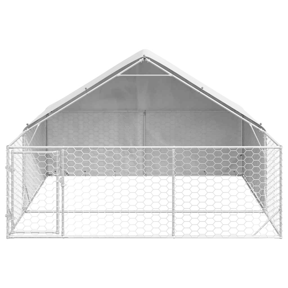 Create a safe and comfortable space for your furry friend with the outdoor dog kennel. Sturdy and durable construction: Crafted from galvanised steel, the dog kennel is designed to withstand the elements and provide long-lasting security for your pets, ensuring they stay safe in any weather condition.Water-resistant cover: The covered kennel features durable PE fabric, providing protection against rain. This sturdy covering ensures your furry friends stay dry, comfortable, and well-sheltered.Secure access: The fence features a convenient door for easy entry and exit, and with its lockable latch system, the kennel ensures your pets stay safely contained at all times.Spacious and well-ventilated: The kennel also includes a generous activity area unsheltered, giving pets plenty of room to explore and play comfortably. Its mesh design ensures airflow, creating a fresh and breathable environment that keeps pets comfortable.Multifunctional design: The dog kennel features a dual-purpose design with a gated, meshed run and a covered area. Your furry friend can enjoy the open air in the meshed area or retreat to the covered section for shade and shelter.