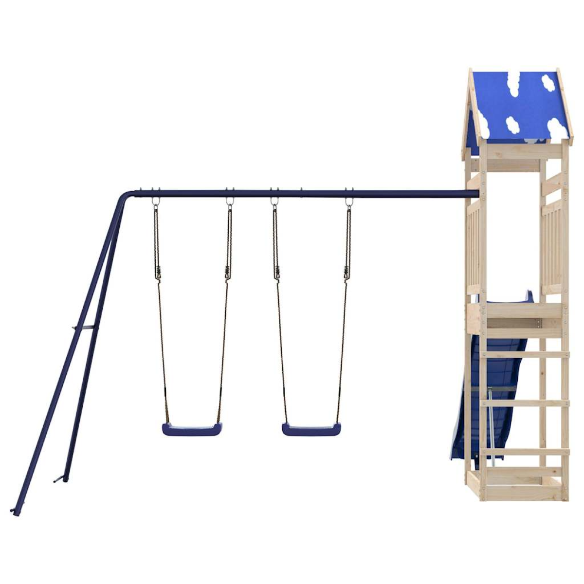 Do you want to give your children the freedom to play at home? This wooden outdoor playset transforms your backyard into a playground for imaginative adventures! Durable material: This garden playset frame is made of solid pine wood. Solid pinewood is known for its strength and durability. Its straight grains and distinctive knots contribute to its rustic charm.Stable wooden frame: The wooden frame of the garden playhouse ensures sturdiness and stability. In addition, the "A" shaped legs of the children's swing allow for balance.Multi-activity centres: The climbing frame features a 118 cm height platform and stands out with its wave slide, a double swing set as well as a sandpit. Your little ones can also invite their friends to join the fun.Thoughtful design: The surrounding wooden railings are designed to ensure the safety of children during their happy play. Also, the cloud roof provides shade for your children on hot summer days.Endless fun: This fun-filled wooden outdoor playset is the perfect way for your children and their friends to enjoy entertainment, have more interactive time and make memories for you and your children! Warning:Only for domestic useOutdoor useNot suitable for children under 3 yearsRecommend user age: 3-8 years old