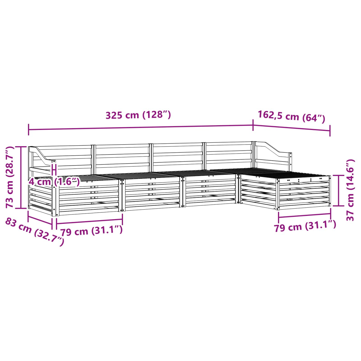 • Overall dimensions: 325 x 162.5 x 73 cm (L x W x H)