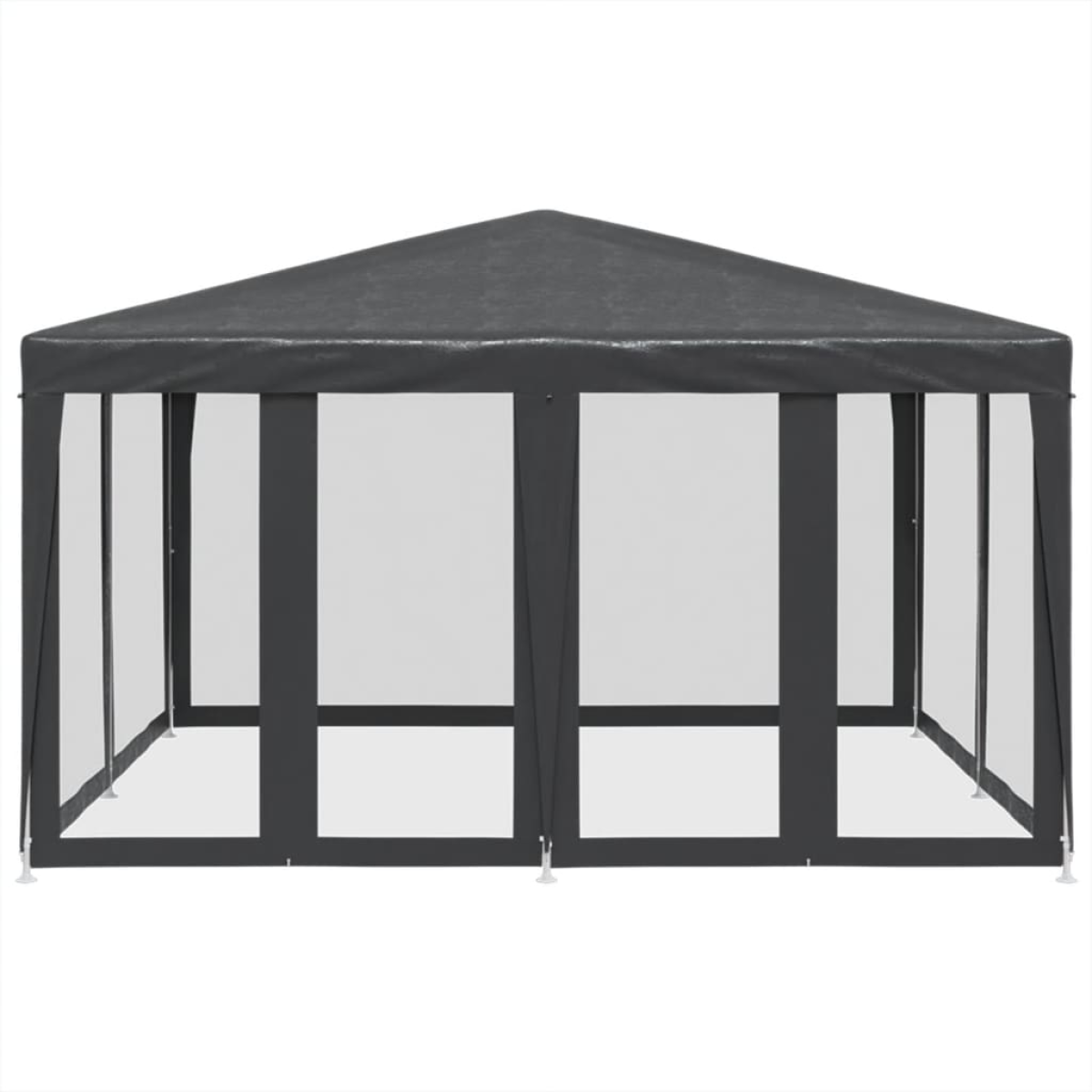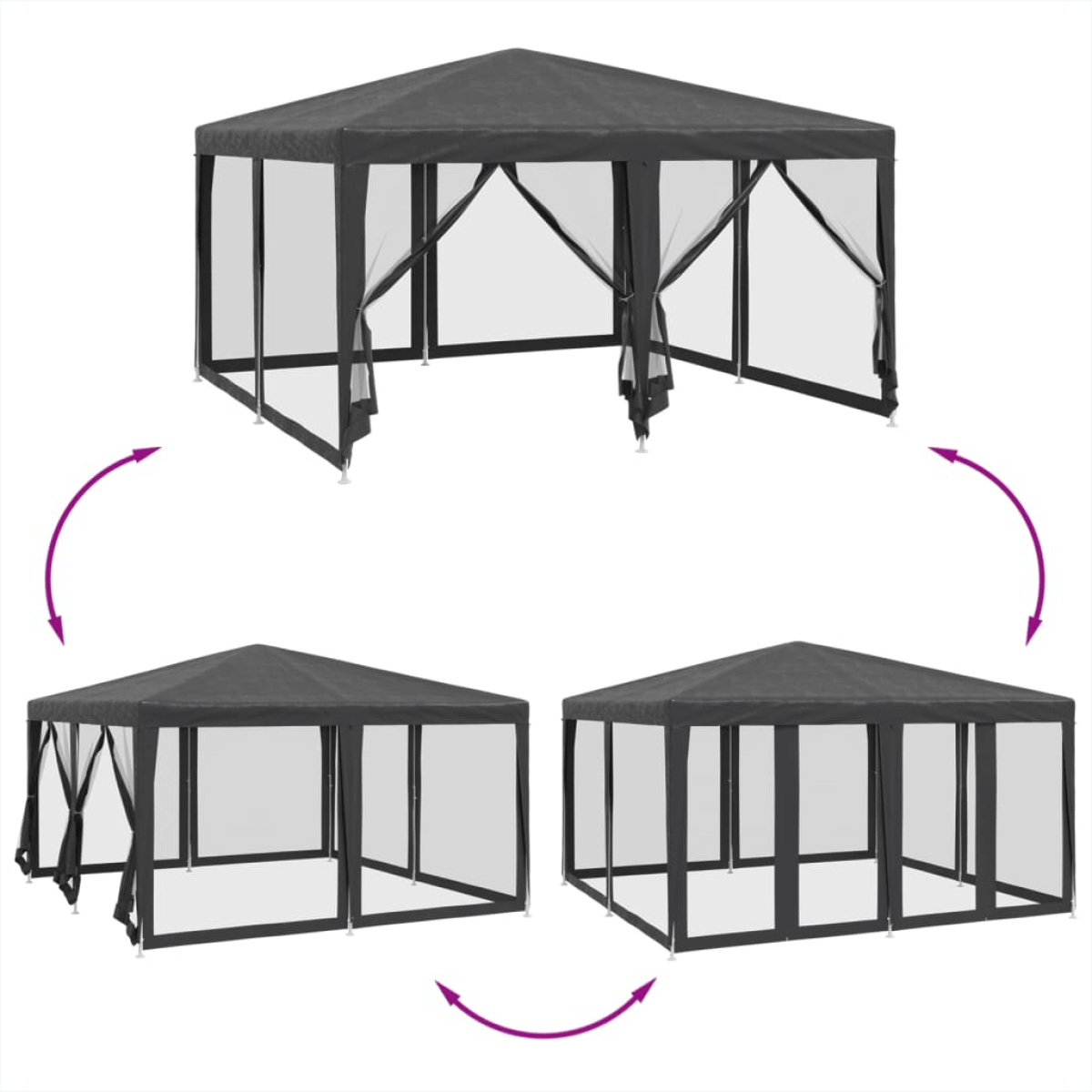 This super cool party tent, with a heavy-duty iron frame, a water-resistant roof and eight mesh sidewalls, is an ideal shelter from the sun. Premium material: This gazebo tent is made of high-density polyethene (HDPE) that protects you from direct sunlight and allows enough wind. The HDPE is specially treated, so it is water-resistant too.Iron frame: The iron frame of this garden tent ensures sturdiness and stability.Practical design: The tent has eight mesh side walls, which protect you from pesky insects. And one of the side walls has 2 zippers for entrance and easy access.Wide applications: This event tent is an ideal choice for a wide range of outdoor events, such as shows, weddings, parties, BBQs, festivals and so on. Good to know:This product should NEVER be used under bad weather, such as strong wind, heavy rain, snow, storm, etc.