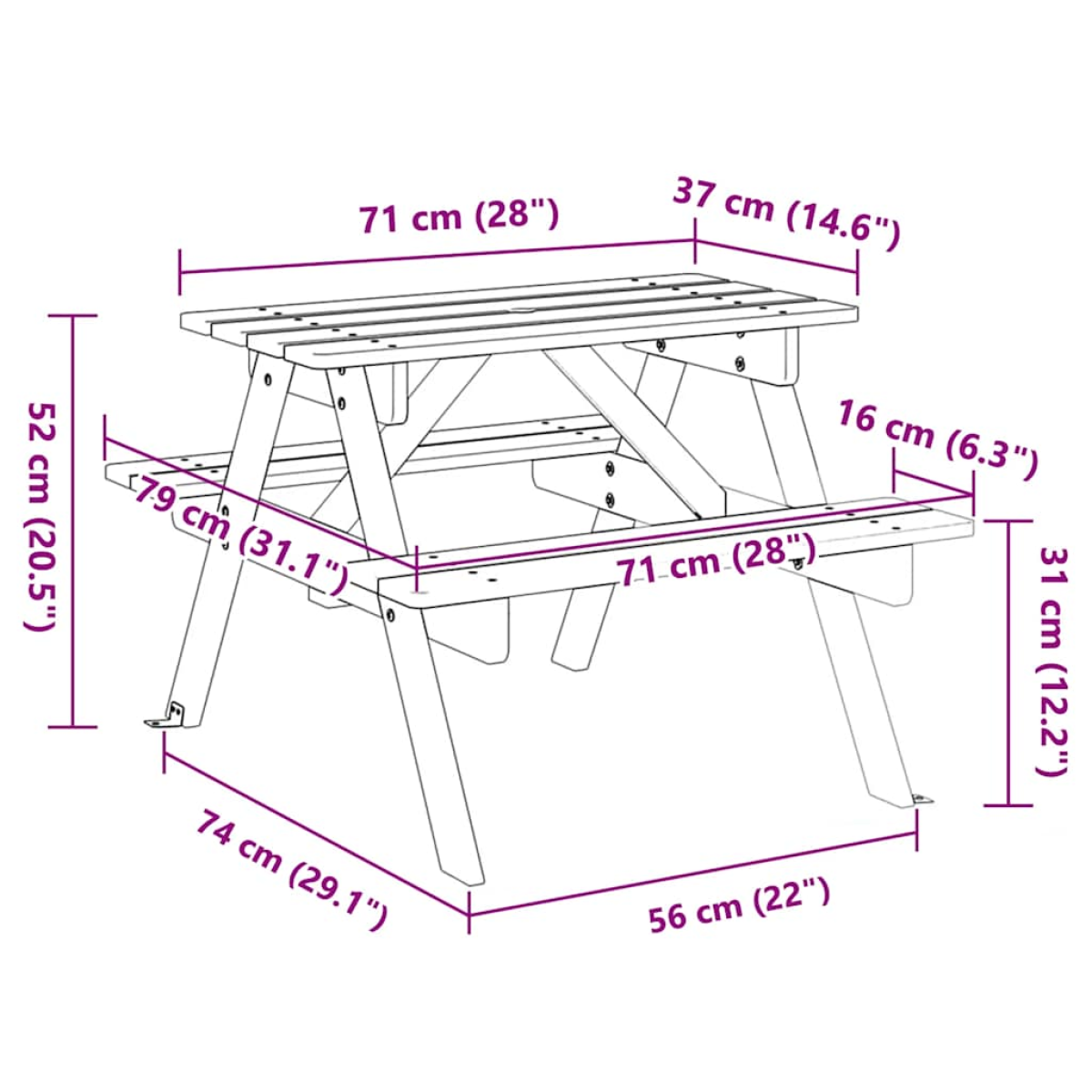 This picnic table is perfect for patios, gardens, and outdoor spaces, providing a comfortable and inviting spot for your kids and their friends to relax and enjoy. 2-in-1 table & bench set: The picnic table with benches is ideal for kids' parties and gatherings, providing ample space for food, drinks, and accessories, as well as comfortable seating for children to enjoy their childhood memories.Reliable and stable material: This picnic table is crafted from solid fir wood, ensuring stability, durability, and longevity.Sturdy and stable structure: This picnic table features an "A"-shaped structure, ensuring stability and safety for kids engaging in various activities.Parasol hole: The tabletop features an umbrella hole, providing the option to add an umbrella for shade on sunny days. Good to know:This product is not suitable for use in bad weather conditions such as strong wind, heavy rain, snow, storms, etc.This delivery includes only one picnic table with integrated benches; the umbrella is not included. Visit this store to find the perfect matching outdoor parasol!