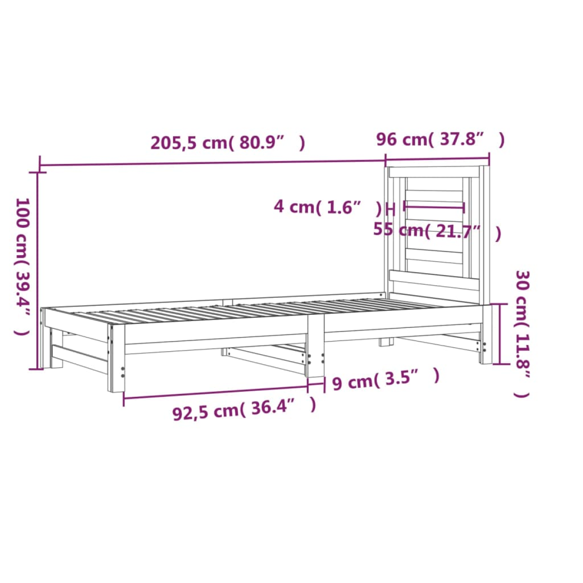 - Daybed dimensions (not extended): 205.5 x 95 x 30 cm (L x W x H)