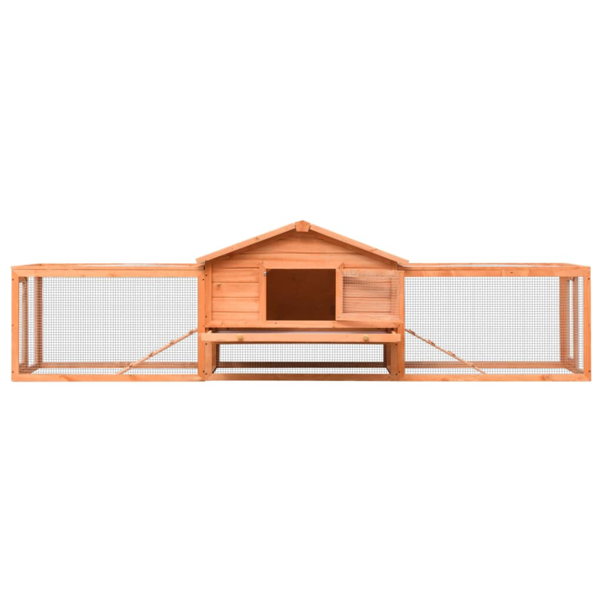 This quality hutch of 2 layers provides a large cosy place for keeping small animals, especially rabbits. It features multiple uses: playing, exercising, training, or simply keeping your pets safely. This rabbit hutch provides with plenty of exercise space while the tight iron wire mesh helps prevent mischievous behaviors and unexpected accidents. Meanwhile, the construction of iron wire grid ensures your monitoring of the pets and enables your pets to get enough fresh air. The rabbit hutch is built with high-quality wooden frame, making it a strong and safe enclosure that lasts for years. Its green roof keeps rain away while the cosy cubby makes the perfect sleeping area. An easy-climb ramp leads from the lower ground level to the upper floor. A pull-out tray makes cleaning easy. The doors close easily and lock with slide-bolt latches. This wooden rabbit cage is easy to assemble.