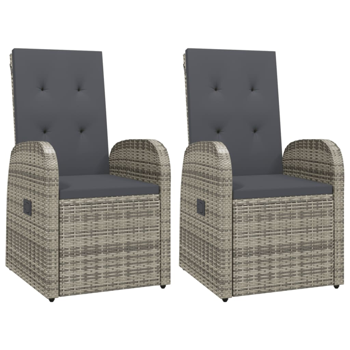 These reclining garden chairs are perfect addition to your garden and terrace, creating a lasting impression! Durable material: PE rattan, also known as poly rattan, is weather resistant and easy to clean. It remains beautiful on the outside for a long period of time. It's more economical than other materials, while offering great quality, convenience and an aesthetic look.Stable frame: The powder-coated steel frame ensures sturdiness and stability.Reclining function: The garden chairs are specially designed with a reclining function so that you can adjust the backrest per your comfort.Comfortable seat experience: Extra cushions are included for your comfort. The seat cushion and back cushion can be connected by zipper for your convenience. Good to know:To make sure your outdoor furniture stays beautiful, we recommend protecting it with a waterproof cover.