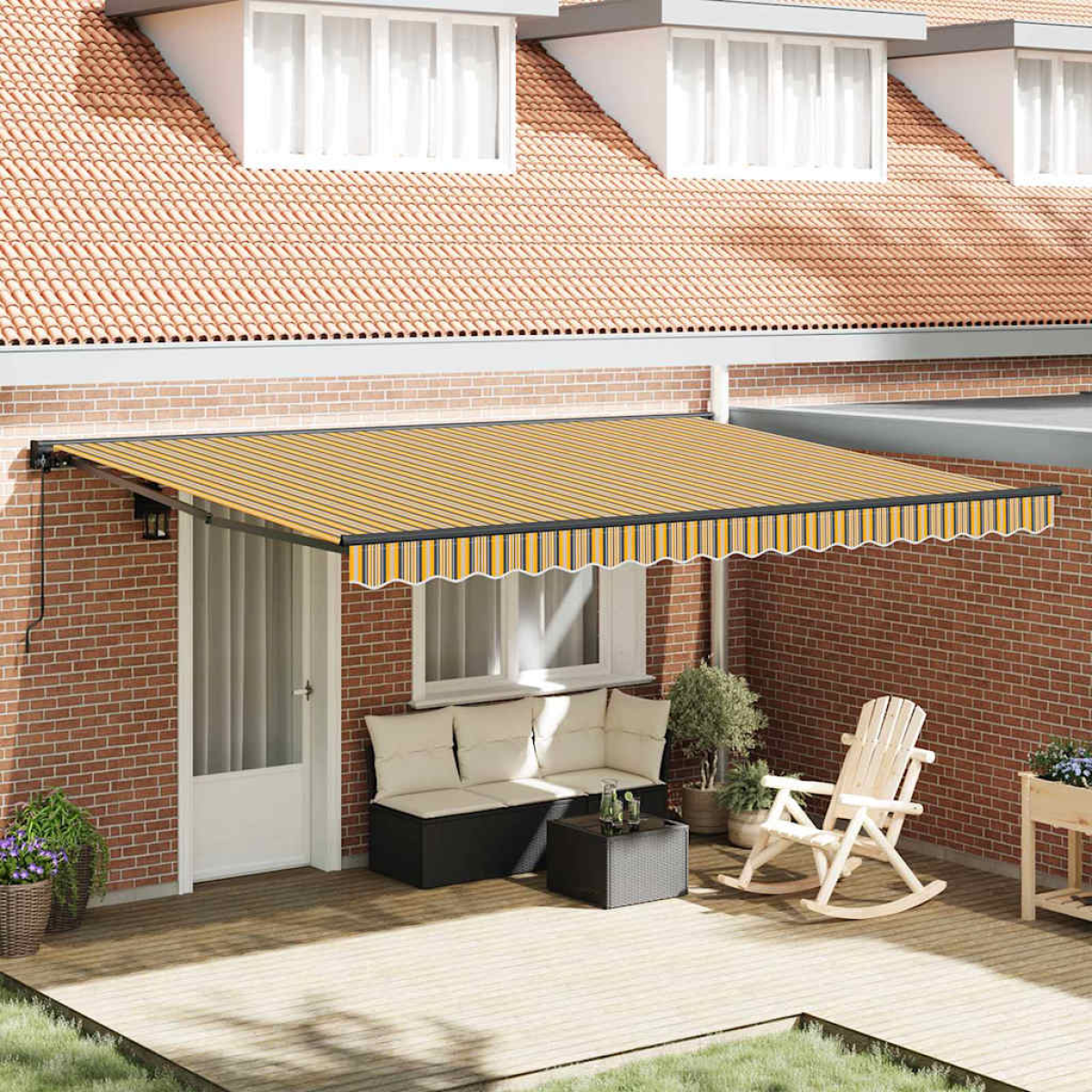 This Modern Retractable Awning is the perfect addition to any garden or terrace, offering a stylish and functional solution for sunshade. With its sleek, clean lines and minimalist design, it enhances the visual appeal of any outdoor space. Whether you're hosting a summer gathering or seeking a tranquil retreat from the sun, it caters to various needs. Its retractable feature allows for flexible shade control, providing comfort during sunny days. Designed for outdoor use, it seamlessly integrates into garden and terrace environments, complementing modern aesthetics. Durable Materials: Made from a combination of polyester and metal, this awning offers a reliable and robust structure. The polyester fabric ensures durability against daily wear, while the metal frame provides steadfast support, enhancing its longevity in varied weather conditions. Retractable Mechanism: Enjoy adaptable shade with the retractable feature. This versatile design allows for easy extension or retraction, accommodating shifting sunlight throughout the day, making it a user-friendly choice for adjustable outdoor comfort. Weather Resistant: Engineered with UV, water, and fade-resistant properties, this awning maintains its appearance and functionality despite harsh weather elements. This feature ensures users can rely on consistent protection and style. Assembly Details: Requires assembly by two people using a screwdriver. This straightforward setup ensures the installation process is manageable and completed with basic tools, making it accessible for homeowners. Summer Appeal: Specifically designed for seasonal use, this awning enhances the usability of outdoor spaces during vibrant summer months, providing necessary shade from the intense heat and creating an inviting ambiance.