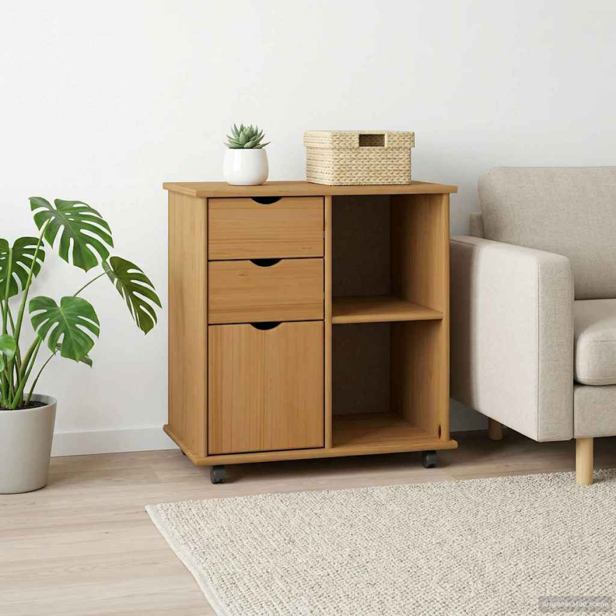 This robust but elegant Minimalist Rolling Cabinet is designed to offer practical storage solutions while enhancing your interior. With its clean lines and sophisticated aesthetic, it fits seamlessly in various settings, be it a chic home office, a cozy bedroom, or a professional workspace. Crafted for functionality, this cabinet boasts a strong presence with its sleek rectangular form, evoking a sense of calm and tidy organization. The alluring matte finish adds to its refined appearance, making it a standout piece in minimalist décor strategies. Materials: Crafted from Solid Pine wood, this rolling cabinet is a testament to quality and traditional craftsmanship. The strength and natural aesthetics of this wood make it perfect for producing robust furniture pieces. The material ensures durability and an attractive minimalist look. Included Components: The cabinet comes with essential components for convenient use. The board shelves, made of premium materials, offer steady support for your items. Additionally, the recessed handles provide an understated but elegant touch, blending seamlessly with the design. Features /Function /Design: Employing a minimalist style, the cabinet emphasizes extreme simplicity with multi-functional purposes. It offers mobility with wheels/casters, which is ideal for keeping your living space dynamic. The design is perfect for those seeking a clutter-free, organized environment. Recommended Uses: Ideal for home office, study, or living room, this versatile cabinet can efficiently store books, office supplies, or just about anything you want. Adaptable for various room aesthetics, it proves useful in both residential and commercial environments. Care &Maintenance: To preserve its appearance, wipe with a damp cloth regularly to remove dust. Avoid using harsh chemicals and abrasives as they may damage the finish. This simple care routine will keep your cabinet looking pristine for years.