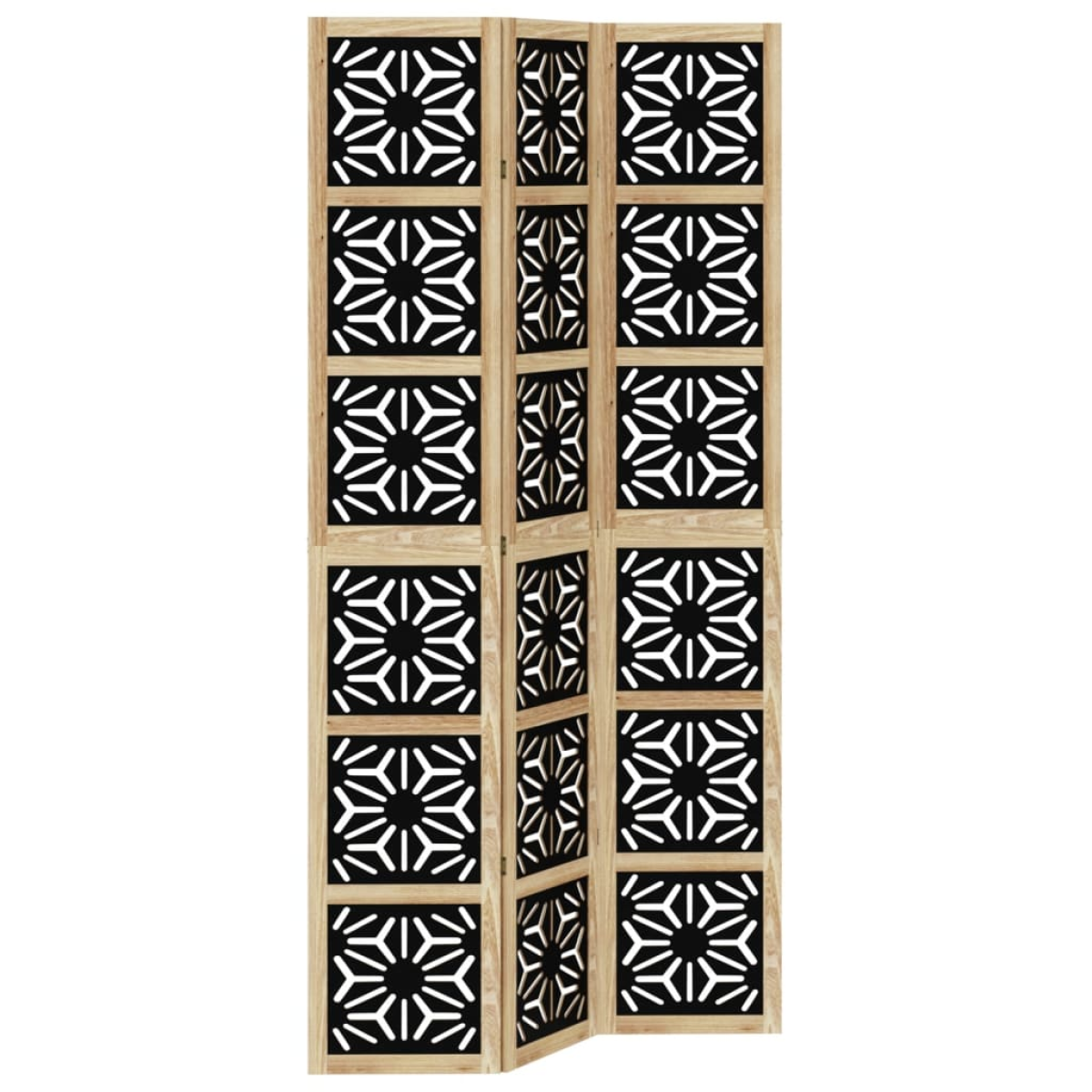 Bring elegance and an eye-catching decorative touch to your space with this charming room divider. Durable and easy to clean: The privacy screen is made from engineered wood, making it easy to clean and durable.Stable frame: The solid paulownia wood frame ensures sturdiness and stability. Solid paulownia wood is a beautiful natural material. Paulownia wood is highly resistant to bugs and rotting.Flexible and easy to fold: Each partition is connected by 3 metal hinges and the upper and lower panels are connected by hidden 2-in-1 hinges. So the room divider panel can be easily folded to some extent according to your needs to save space.Multipurpose: The room partition is great for creating private space in your bedroom, living room, office and other interiors. You can also place it in front of a window to block intense sunlightAttractive looking: Featuring a geometric cut-out design, this folding room divider adds character and decoration to the space. Warning:Only for indoor use.