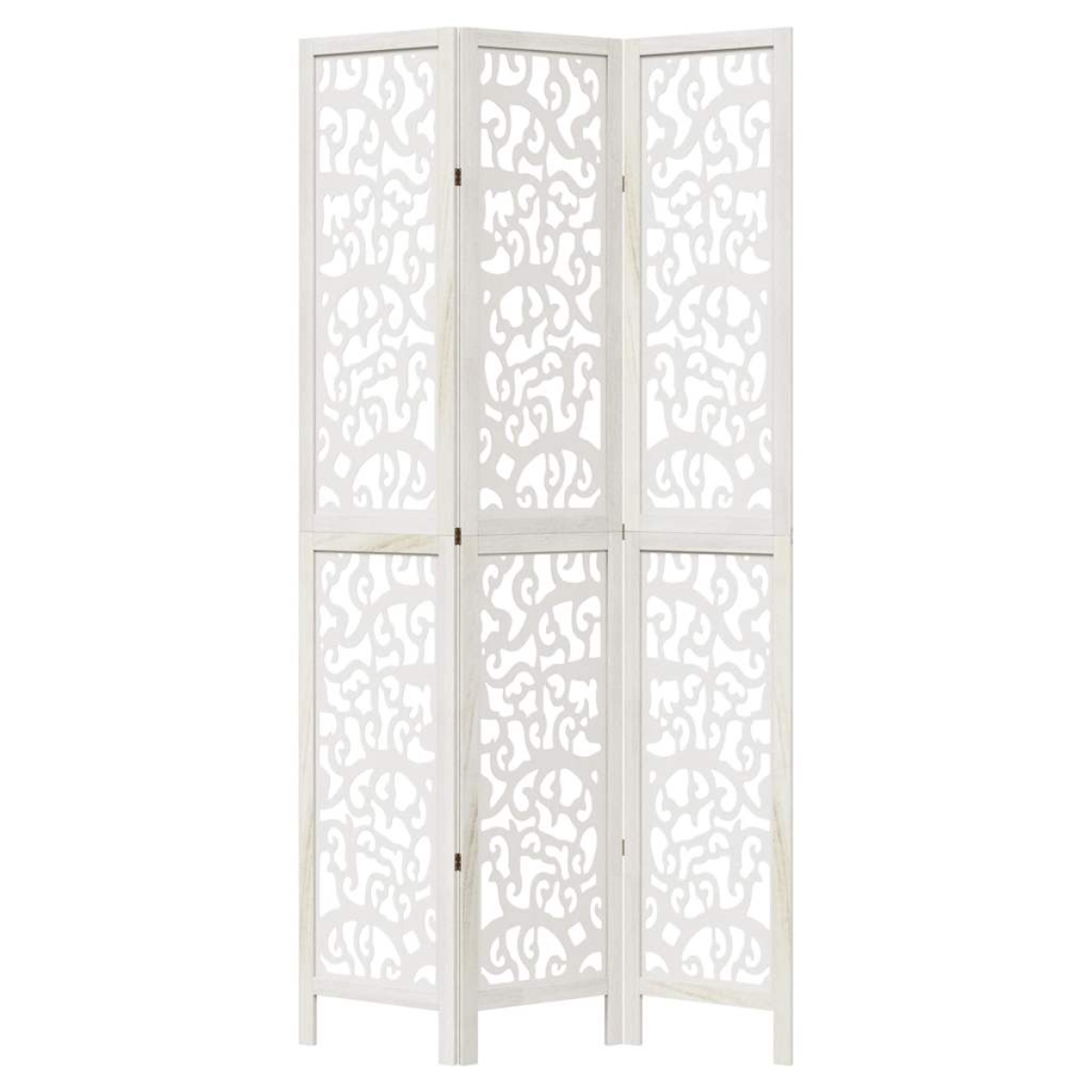Bring elegance and an eye-catching decorative touch to your space with this charming room divider. Durable and easy to clean: The privacy screen is made from engineered wood, making it easy to clean and durable.Stable frame: The solid paulownia wood frame ensures sturdiness and stability. Solid paulownia wood is a beautiful natural material. Paulownia wood is highly resistant to bugs and rotting.Flexible and easy to fold: Each partition is connected by 3 metal hinges and the upper and lower panels are connected by hidden 2-in-1 hinges. So the room divider panel can be easily folded to some extent according to your needs to save space.Multipurpose: The room partition is great for creating private space in your bedroom, living room, office and other interiors. You can also place it in front of a window to block intense sunlight.Attractive looking: Featuring a delicate openwork looking, this folding room divider adds character and decoration to the space. Warning:Only for indoor use.