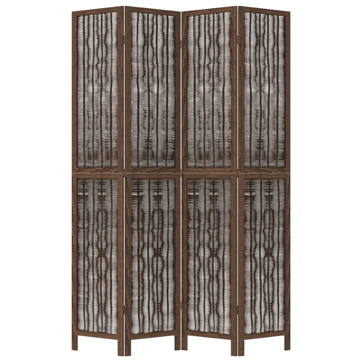Bring elegance and an eye-catching decorative touch to your space with this charming room divider. Durable and easy to clean: The privacy screen is made from willow twig, making it easy to clean and durable.Stable frame: The solid paulownia wood frame ensures sturdiness and stability. Solid paulownia wood is a beautiful natural material. Paulownia wood is highly resistant to bugs and rotting.Flexible and easy to fold: Each partition is connected by 3 metal hinges and the upper and lower panels are connected by hidden 2-in-1 hinges. So the room divider panel can be easily folded to some extent according to your needs to save space.Multipurpose: The room partition is great for creating private space in your bedroom, living room, office and other interiors. You can also place it in front of a window to block intense sunlight.Burnt looking: Featuring a burnt look, this folding room divider adds character and decoration to the space. Warning:Only for indoor use.