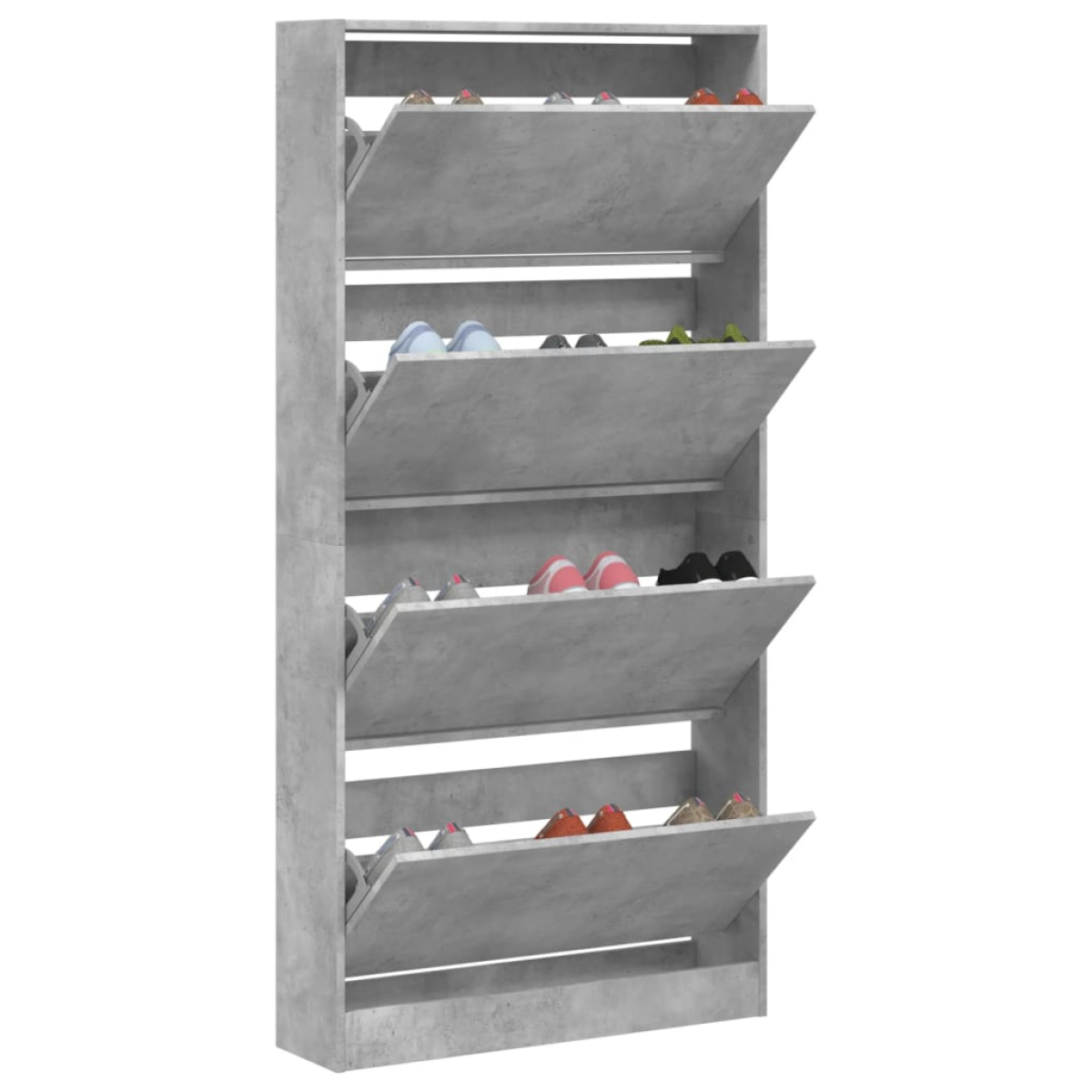 Keep your shoes well-organised and always at hand with this shoe cabinet! Durable material: The engineered wood is of exceptional quality with a smooth surface and features strength, stability and resistance to moisture.Space-saving design: The shoe rack makes optimal use of vertical space and takes up little floor space, which is especially suitable for small rooms.Ample storage space: The shoe storage cabinet features flip-drawers that keep your shoes invisible to offer a clean and clutter-free living area.Trendy design: The shoe cupboard features clean lines and a minimalistic look that add a modern touch to your existing decor. Warning:To prevent it being overturned, this product must be used with the provided wall attachment device. Good to know:Screws and plugs for inside the wall are not included. We advise to find and use screws and plugs suitable specifically for your walls. If you're not sure, you can consult with a professional. Please read and follow each step of the instructions.