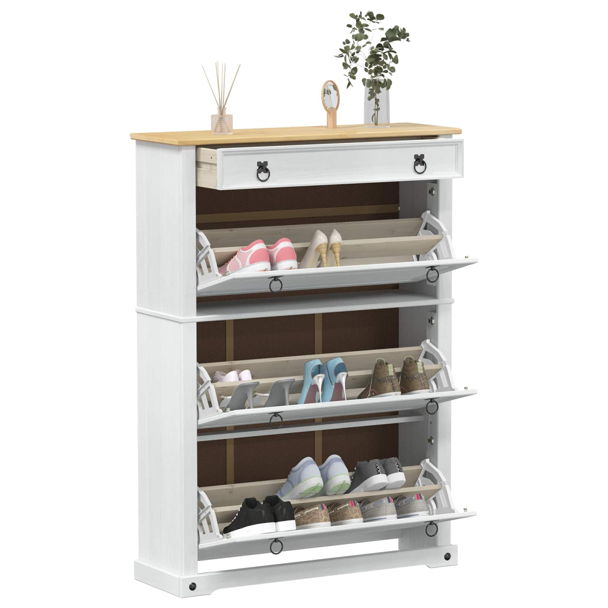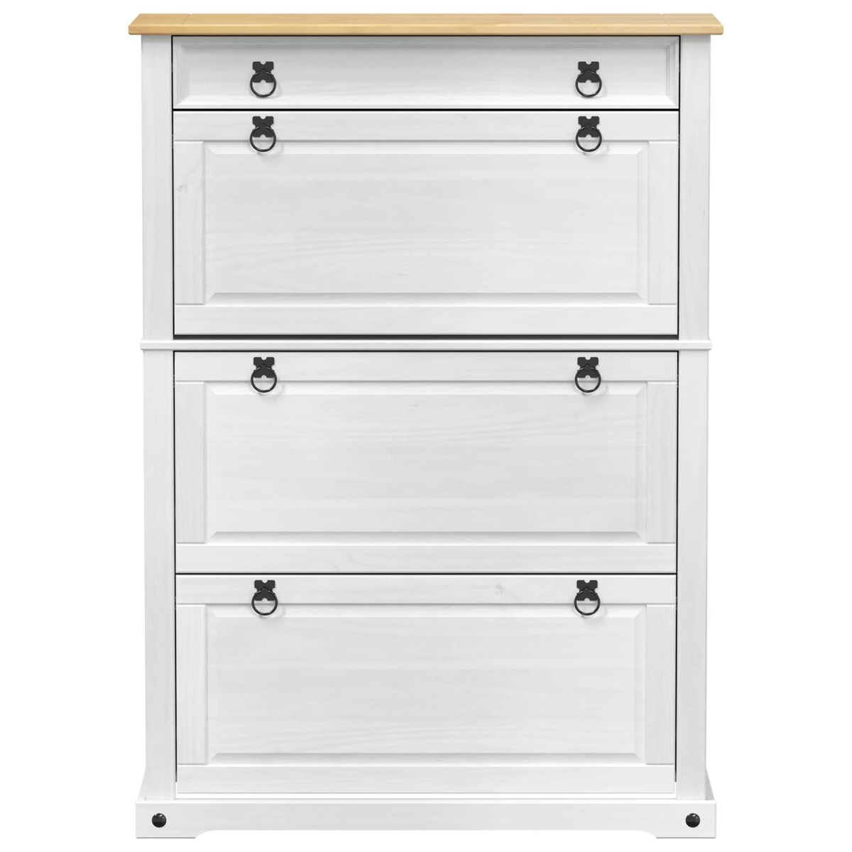 The Solid Wood Shoe Cabinet exemplifies rustic elegance and is an excellent addition for any home seeking a touch of natural charm. This shoe storage cabinet is designed to fit seamlessly into various spaces, providing not only a storage solution but accentuating home decor with its rich, solid pine wood structure. Its versatile rectangular silhouette allows for easy placement in entryways, halls, or bedrooms where it can gracefully complement existing furniture while offering ample storage for all your footwear needs. Solid Pine Wood Material The cabinet is expertly crafted from solid pine wood, providing strength and stability for long-term use. The distinctive natural grain patterns add a layer of unique rustic appeal, ensuring that each piece is as individual as the next. These material qualities stand up well to daily wear, making it a reliable choice for any busy household. Solid Pine Wood Components The entire cabinet, including the frame, back, and surface, boasts a cohesive solid pine wood construction. This not only contributes to its sturdiness but enhances its visual consistency. The robust construction of these components ensures that the cabinet retains its form and function over time, offering both organizational and aesthetic benefits. Functional Design Features Designed to offer exceptional storage, the cabinet's generous compartments can accommodate a wide variety of shoes, from boots to sandals. The wood grain adds character, while the cabinet enhances organization in entryways and bedrooms alike. Its matte finish provides a sophisticated, seamless integration into diverse interior styles. Ideal Usage Scenarios Whether positioned in a hallway, entrance, or closet, this storage cabinet aids efficient space utilization. The shoe cabinet's versatility makes it suitable for apartments or larger homes, facilitating a clutter-free environment and keeping flooring clear of stray footwear. Maintenance Guidelines Caring for this shoe cabinet is straightforward. Simply wipe down the surface with a damp cloth to maintain its lustrous appearance. This easy maintenance ensures the cabinet continues to be a focal point of your home while requiring minimal effort.