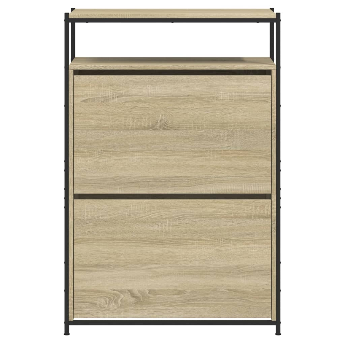 This shoe cabinet is an excellent choice to store your shoes in an organised way, especially for tight and narrow spaces thanks to its compact design. Durable material: The engineered wood is of exceptional quality with a smooth surface and also features strength, stability, and resistance to moisture.Ample storage space: This shoe rack features 1 shelf and 2 flip drawers, providing ample space to keep your shoes within reach and well organised.Practical top: The sturdy top of the shoe cupboard is ideal for displaying decorative objects, photo frames, or potted plants.Space-saving design: The slim shoe storage cabinet is designed to perfectly fit small spaces like entryway, hallway, mudroom, etc. Warning:To prevent it from tipping over, this product must be used with the provided wall attachment device.