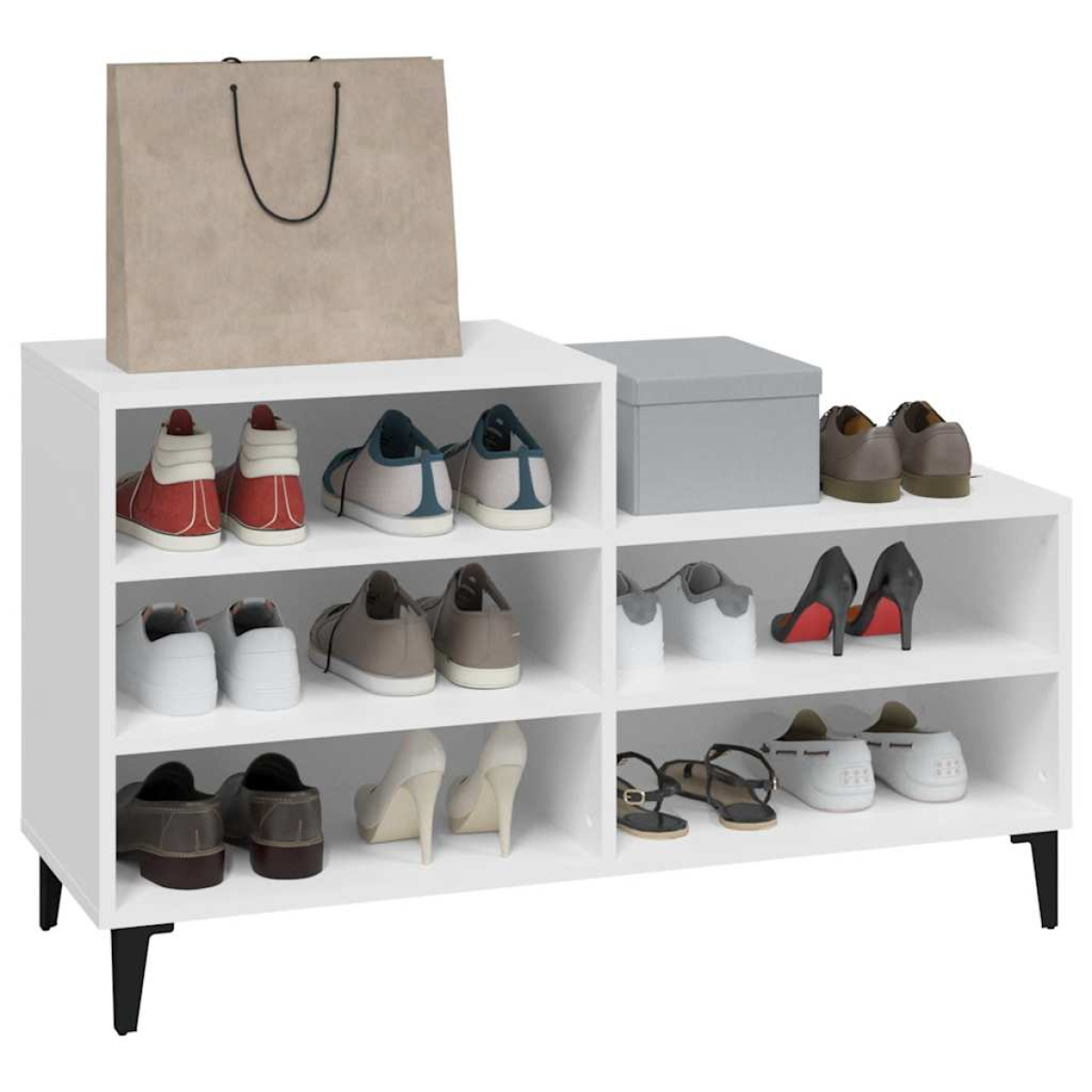With this compact shoe cabinet, you will never have to be annoyed by shoes cluttering up your house again! Practical material: This shoe rack is made of engineered wood. The engineered wood is of exceptional quality with smooth surface and also features strength, stability and resistance to moisture.Ample storage: With 5 shelves, this shoe storage can accommodate your shoes, storage boxes, and other items.Stable frame: The metal feet add an industrial and calm style to your interior while ensuring stability.Sturdy top: The sturdy top of the shoe storage is ideal for displaying decorative objects, photo frames, or potted plants. It can also be used as a console cabinet, side cabinet, etc. Warning:In order to prevent overturning, this product must be used with the wall attachment device provided. Note:Each product comes with an assembly manual in the box for easy assembly.