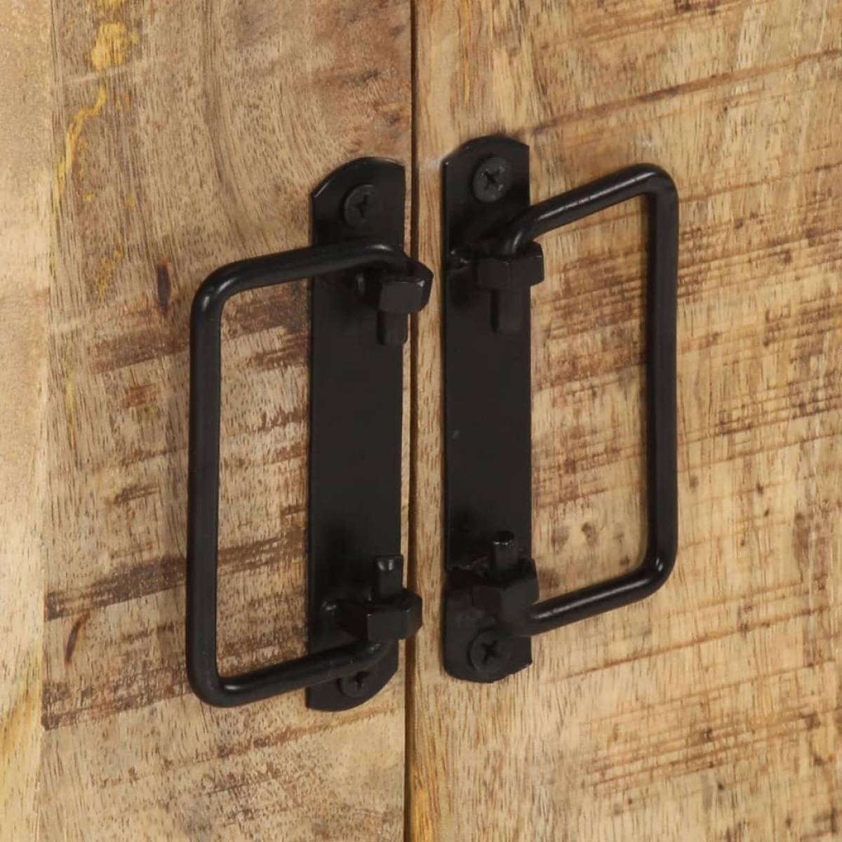 This wooden side cabinet exudes a vintage charm and will make a timeless addition to your interior. This cabinet is made of solid mango wood, a hardwood with dense grains. Rough mango wood not only boasts the strength to bear the weight, but also stands the wear and tear of time. Consequently, this beautifully-designed commode is exceedingly stable, durable and eye-catching. The exquisite craftsmanship guarantees that every step of the process is carried out with the greatest care, be it polishing, painting or lacquering. Additionally, the powder-coated steel frame adds the side cabinet's industrial style and sturdiness. Besides, this sideboard features 2 cabinets with 3 doors and 1 compartment, providing ample space for storing your multimedia appliances, clothing, books, as well as various other items. Important note: The wood grains vary from piece to piece, making each piece unique. The delivery is random, ensuring the exclusivity and individuality of your product.