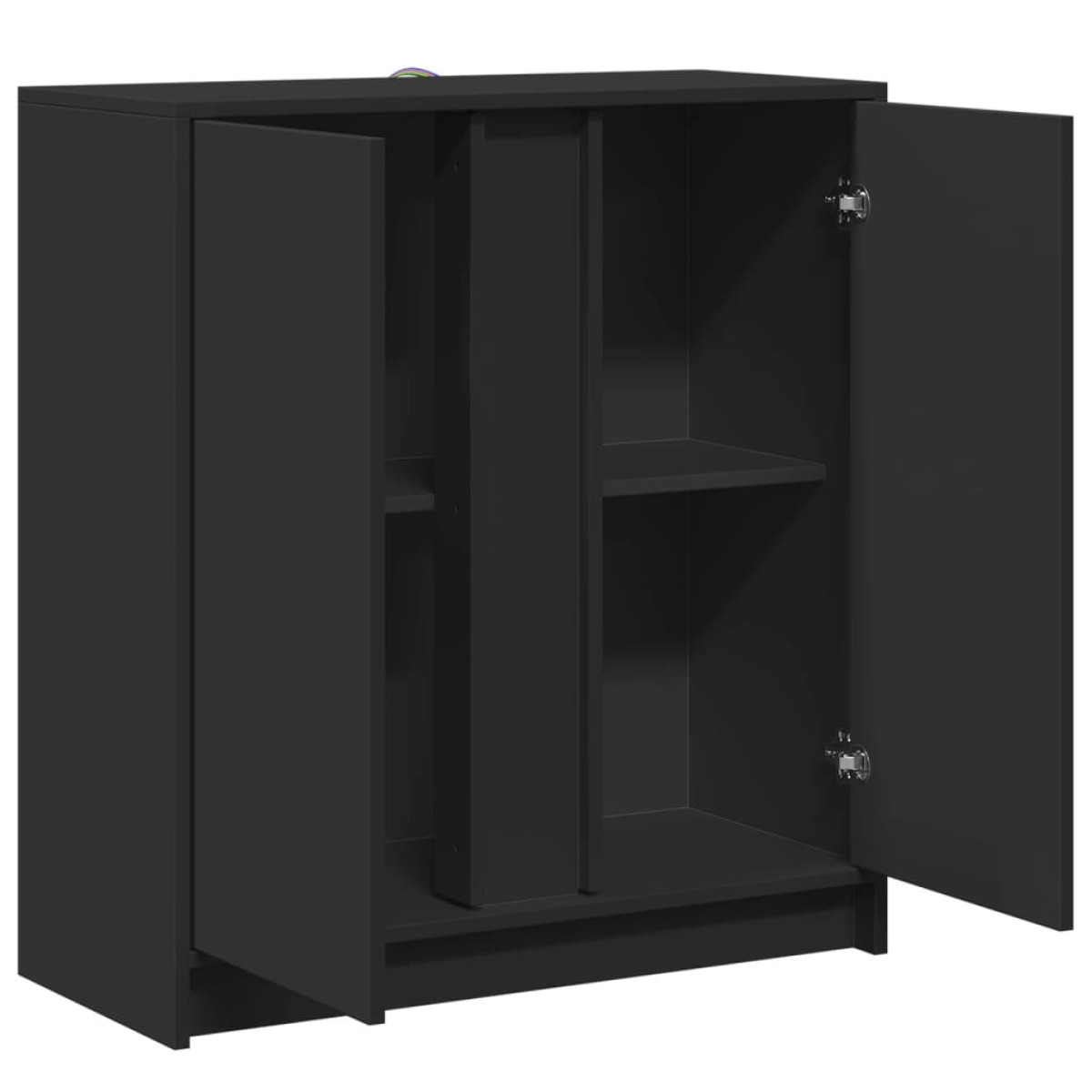 Decorate your room with this modern sideboard with LED lights, it easily blends with furniture in any style at your house. Durable material: The engineered wood is of exceptional quality with smooth surface and also features strength, stability and resistance to moisture.RGB LED lights: The buffet is equipped with vibrant RGB LED lights. With various customisable menus, you can effortlessly change the colour of the lights and even set them to adjust automatically. These LED lights not only enhance the contemporary look of the sideboard cabinet but also add to its trendy appeal.Ample storage space: The storage cabinet offers plenty of space to keep your everyday items neatly arranged and easily accessible.Displaying function: The sturdy top of the hallway cabinet is ideal for displaying decorative objects, photo frames, or potted plants.Practical doors: Keep your essentials free from dust by hiding them behind the doors of the side cabinet. Good to know:The product has a USB connector that requires a certified 5V USB power source (not included). Warning:To prevent it from tipping over, this product must be used with the provided wall attachment device.