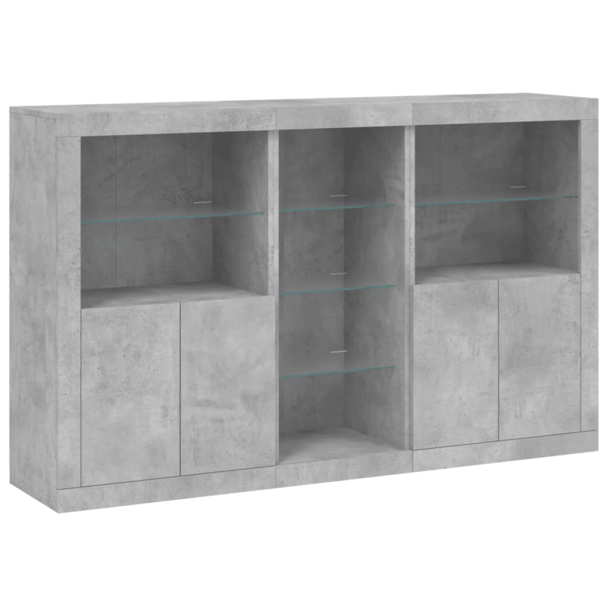 Decorate your room with this modern sideboard with LED lights, it easily blends with furniture in any style at your house. Durable material: The engineered wood is of exceptional quality with smooth surface and also features strength, stability and resistance to moisture.RGB LED lights: The buffet is equipped with vibrant RGB LED lights. With various customisable menus, you can effortlessly change the colour of the lights and even set them to adjust automatically. These LED lights not only enhance the contemporary look of the sideboard cabinet but also add to its trendy appeal.Ample storage space: The storage cabinet offers plenty of space to keep your everyday items neatly arranged and easily accessible.Displaying function: The sturdy top of the hallway cabinet is ideal for displaying decorative objects, photo frames, or potted plants.Practical doors: Keep your essentials free from dust by hiding them behind the doors of the side cabinet. Good to know:The product has a USB connector that requires a certified 5V USB power source (not included). Warning:To prevent it being overturned, this product must be used with the provided wall attachment device.