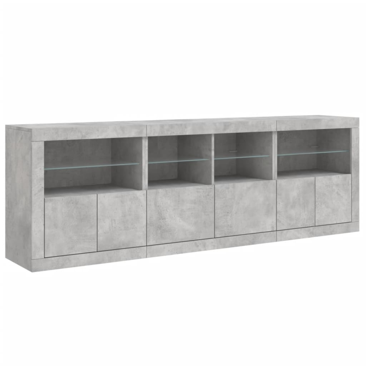 Decorate your room with this modern sideboard with LED lights, it easily blends with furniture in any style at your house. Durable material: The engineered wood is of exceptional quality with smooth surface and also features strength, stability and resistance to moisture.RGB LED lights: The buffet is equipped with vibrant RGB LED lights. With various customisable menus, you can effortlessly change the colour of the lights and even set them to adjust automatically. These LED lights not only enhance the contemporary look of the sideboard cabinet but also add to its trendy appeal.Ample storage space: The storage cabinet offers plenty of space to keep your everyday items neatly arranged and easily accessible.Displaying function: The sturdy top of the hallway cabinet is ideal for displaying decorative objects, photo frames, or potted plants.Practical doors: Keep your essentials free from dust by hiding them behind the doors of the side cabinet. Good to know:The product has a USB connector that requires a certified 5V USB power source (not included). Warning:To prevent it being overturned, this product must be used with the provided wall attachment device.