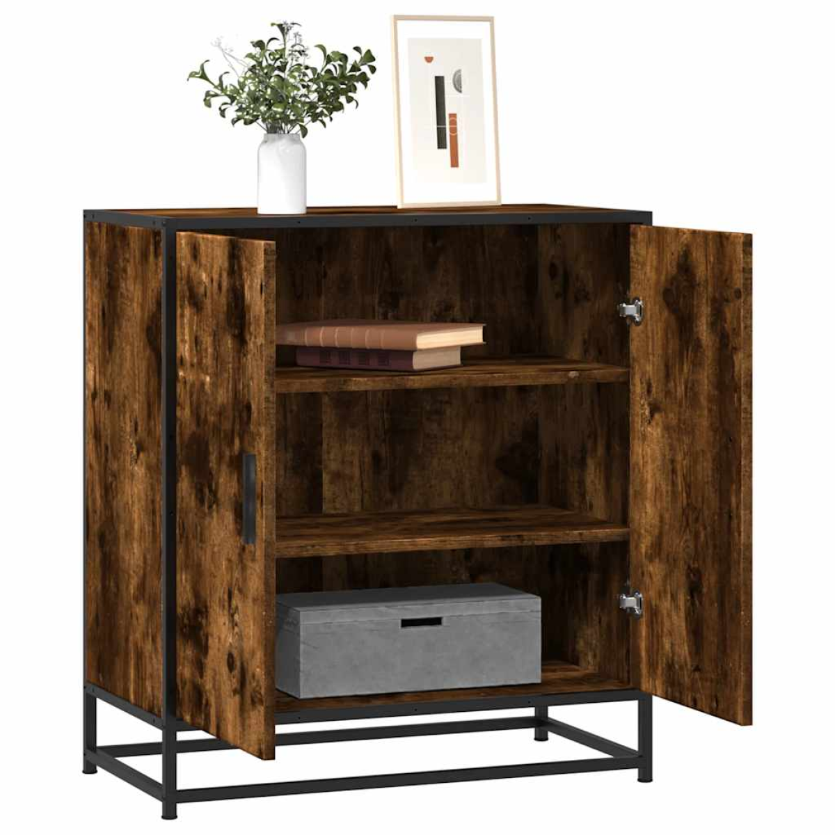 This modern sideboard, featuring a timeless look, is meant to be an excellent addition to your home. Stable and long-lasting frame: The metal frame of the storage cabinet enhances your interior with an industrial style and provides exceptional durability, stability and resistance to corrosion.Stable and durable material: Engineered wood is a durable and stable material with a smooth surface that is resistant to moisture, warping, and splitting, making it a reliable choice for a variety of projects.Ample storage space: The sideboard cabinet features 3 shelves behind the doors, which offers ample storage space for dining essentials and other household items to keep them organised and within reach.Practical handles: The side cabinet comes with handles that provide a comfortable grip, helping you open and close the cabinet easily while adding extra beauty.Metal feet: The metal feet add a calm style to your interior while ensuring stability. Warning:To prevent it from tipping over, this product must be used with the provided wall attachment device.