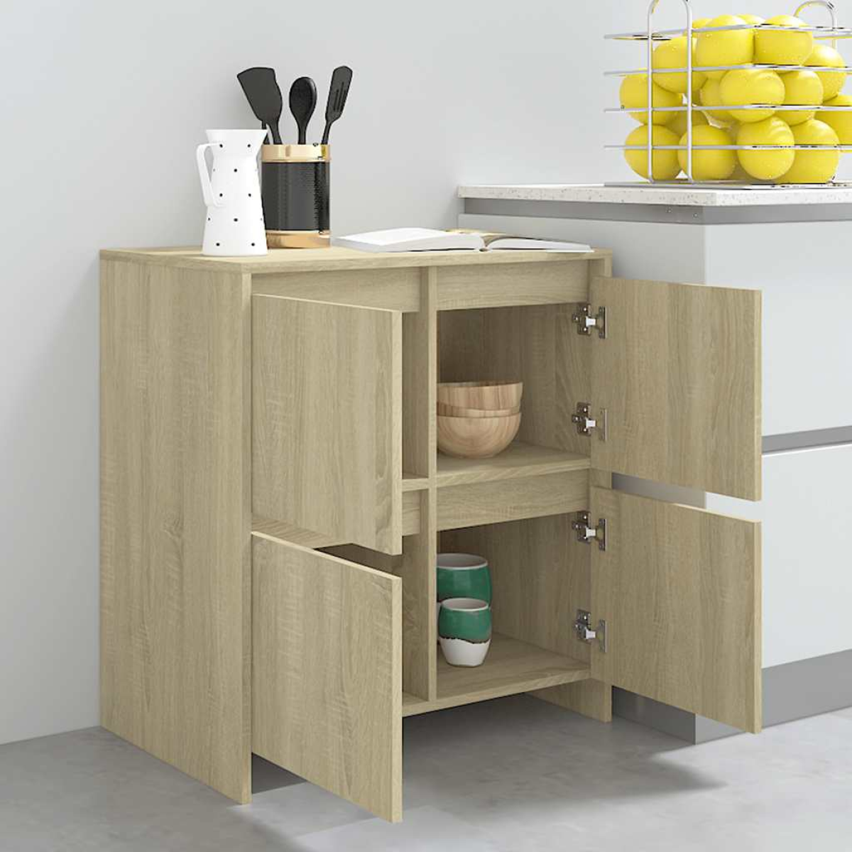 This sideboard, featuring a minimalist design, is meant to be a practical as well as an exceptionally decorative addition to your home. With 4 doors, the side cabinet provides ample storage space for books, multimedia appliances and other items. The sturdy tabletop is ideal for displaying decorative objects, photo frames, and potted plants. Additionally, the storage cabinet is easy to clean with a damp cloth.