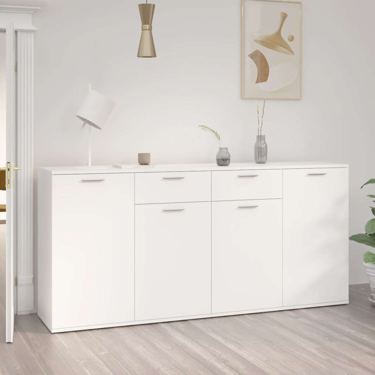 Enhance your living or dining area with this modern storage unit, combining stylish design with practical functionality. It keeps essentials organised while adding a contemporary accent to your home décor.Ample Storage Capacity: Two drawers and spacious shelves provide room for books, electronics, décor, and everyday items, helping maintain a tidy, clutter-free environment.Minimalist Modern Design: Clean lines, subtle details, and a matte finish create a calm, contemporary look that complements diverse interiors and serves as a stylish focal point.Durable Engineered Wood: Crafted from high-quality engineered wood, this unit resists scratches, stains, and daily wear, ensuring long-lasting durability and polished appearance.Safe and Versatile: Freestanding design offers stability, and optional wall-mounting provides extra security. Functions as a media console, buffet, or general storage unit for flexible use. Upgrade your home with this elegant storage solution that combines functionality, durability, and contemporary style.