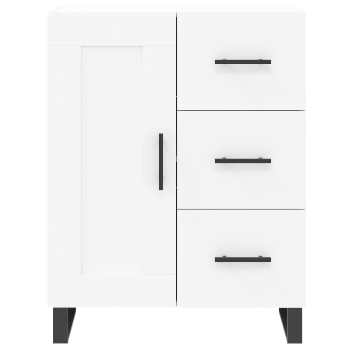 This trendy sideboard, featuring a timeless look, is meant to be an excellent addition to your home. Durable material: The engineered wood is of exceptional quality with smooth surface and also features strength, stability and resistance to moisture.Ample storage space: The sideboard cabinet has 2 compartments and 3 drawers, providing ample storage space for keeping your various daily essentials well organised and within easy reach.Displaying function: The top of the cupboard is perfect for placing potted plants, framed photos and other decorative items.Practical door and handles: Keep your essentials free from dust by hiding them behind the door. In addition, the handles on the door and drawers make it easy to open the storage cabinet.Metal legs: The metal legs add a modern and calm style to your interior while ensuring stability. Warning:To prevent it being overturned, this product must be used with the provided wall attachment device.