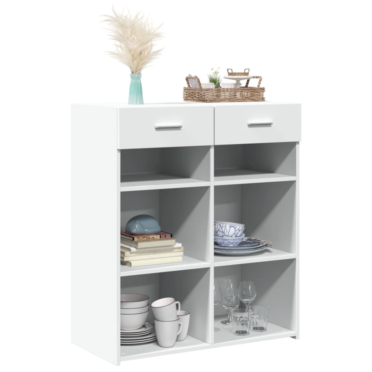 This classic sideboard is meant to make a decorative and practical addition to your home. Long-lasting material: The engineered wood is of exceptional quality with a smooth surface and also features strength, stability, and resistance to moisture.Ample storage space: This sideboard cabinet with 2 drawers provides ample storage space for keeping your various daily essentials well-organised and within easy reach. Easy to clean: The cupboard is easy to clean with a damp cloth and requires less maintenance.Warning:To prevent it from tipping over, this product must be used with the provided wall attachment device.