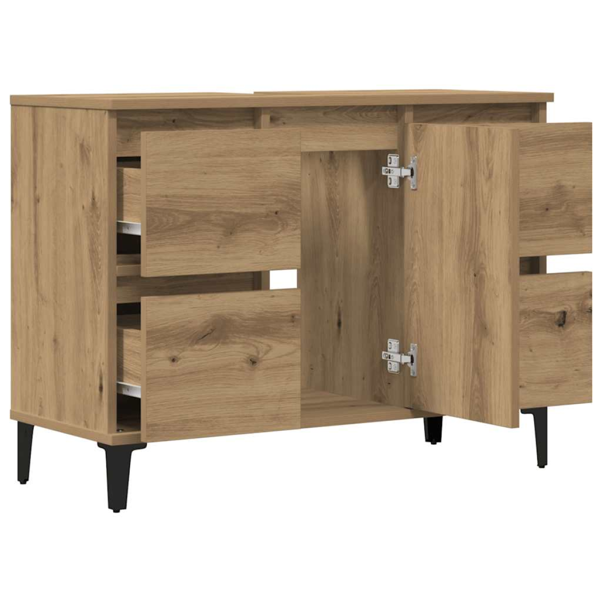 This sink cabinet is meant to be a great addition to your bathroom, giving it a tidy and striking appearance! Durable material: The engineered wood is of exceptional quality with smooth surface and also features strength, stability, and resistance to moisture.Ample storage space: The bathroom sink cabinet has 4 drawers and 1 compartment with a door, offering various storage options and extra space to store items in your bathroom. The top of the bathroom cabinet is ideal for placing the sink.Metal feet: The metal feet add a modern and calm style to your interior while ensuring stability.Easy-to-clean surface: The bathroom furniture is easy to clean with a damp cloth. Warning:To prevent it being overturned, this product must be used with the provided wall attachment device. Good to know:To make assembly as easy as possible, each product is delivered with a manual.The sink is not included.