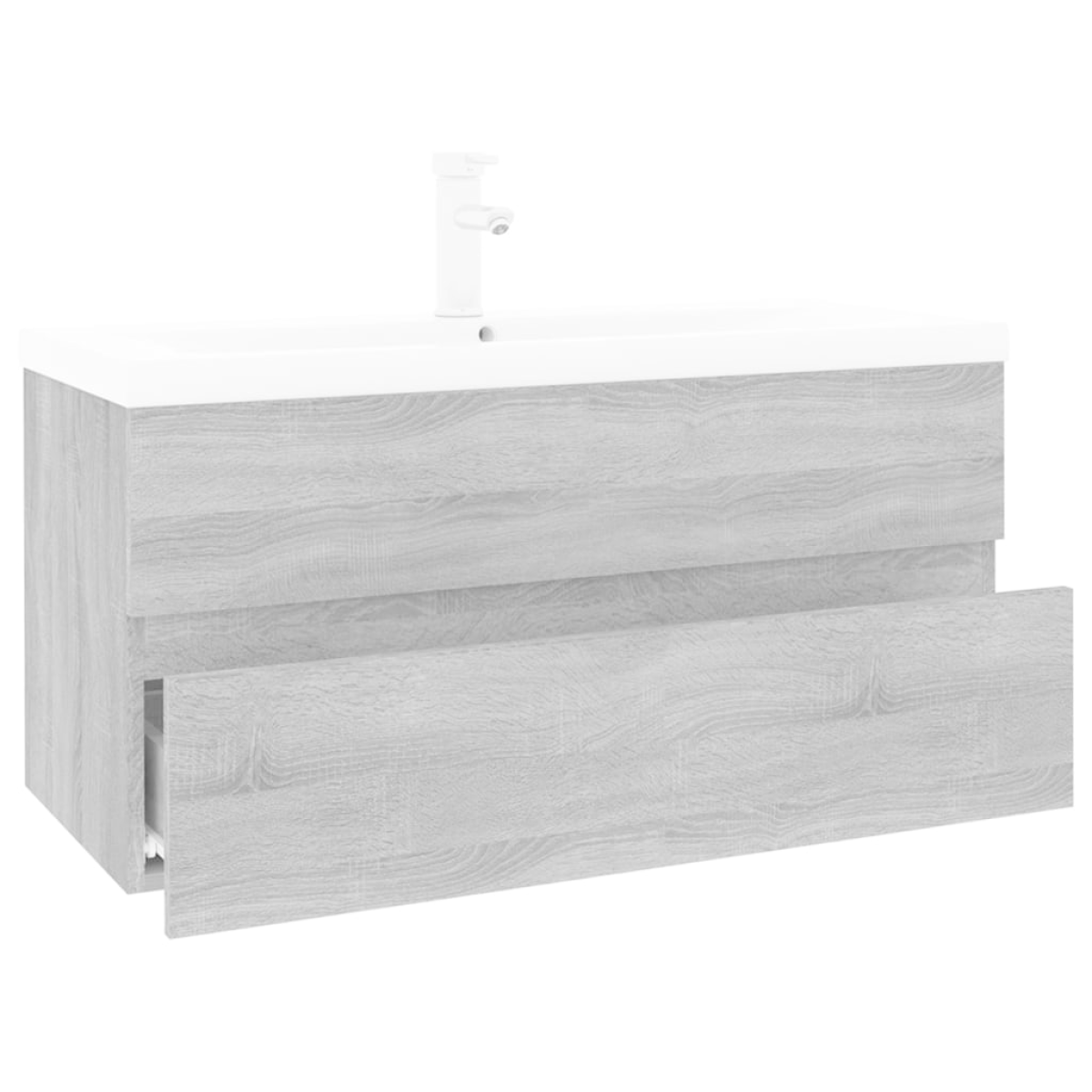 This stylish sink cabinet with a built-in basin, featuring spacious storage space, is an excellent addition to your bathroom, giving it a tidy and striking appearance! Sturdy material: The under sink cabinet is made of engineered wood, that is of exceptional quality with smooth surface and also features strength, stability and resistance to moisture.Ample storage: The bathroom sink unit features a drawer, offering ample storage space to store items in your bathroom.Practical design: The top of this bathroom cabinet is ideal for placing the sink.Wall-mounted function: The bathroom cabinet can be wall-mounted to add extra storage space. That way, you can maximise your floor space and keep the area clean.Overflow function: An overflow is also equipped to flow water out when it gets too full. Note:Screw(s) and plug(s) for inside the wall are not included. Seek and use screw(s) and plug(s) suitable for your walls. If you are uncertain, seek professional advice. Read and follow each step of the instruction carefully.The tap and the drain are not included in delivery.Each product comes with an assembly manual in the box for easy assembly.
