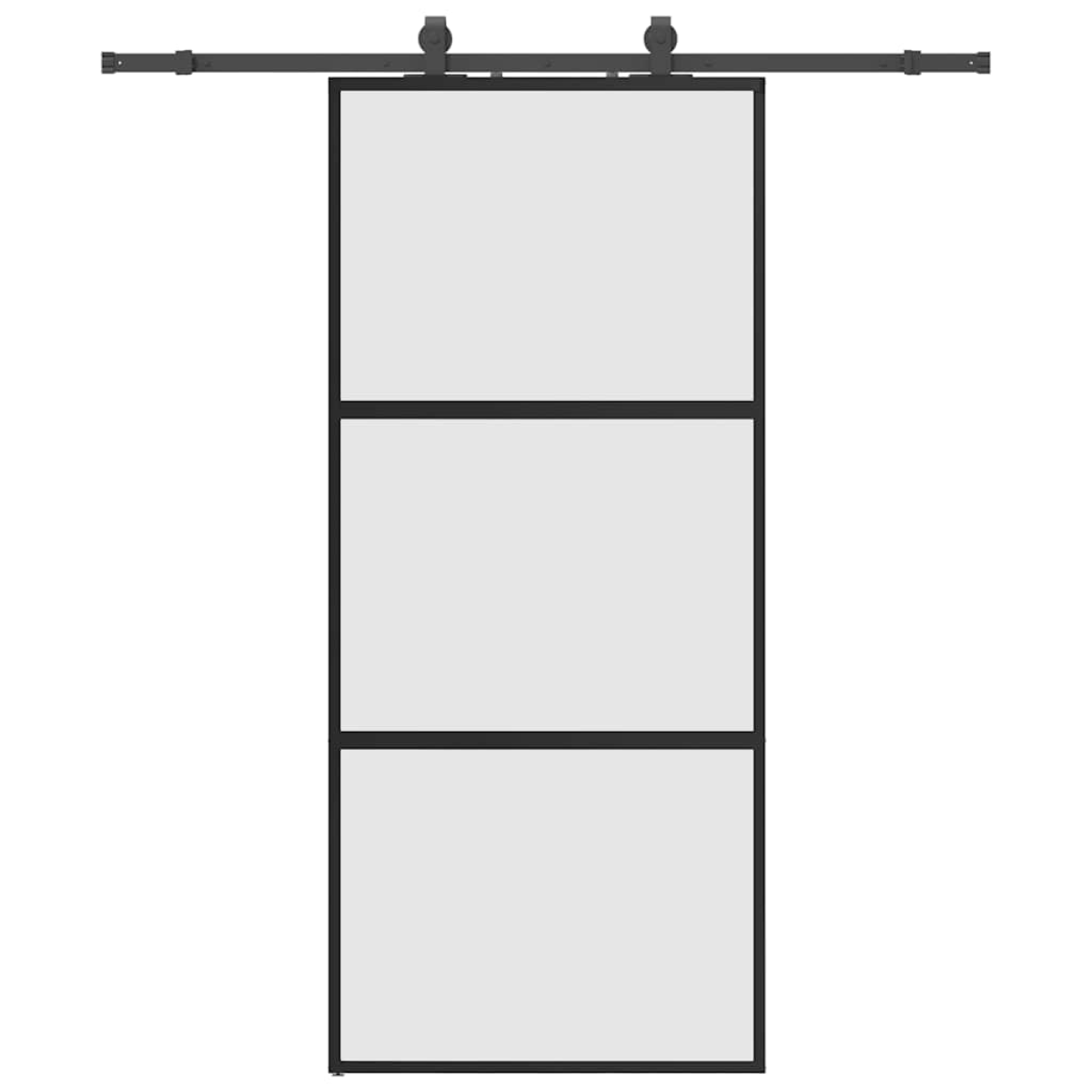 Create a stylish transition from one room to another with this sliding door! Durable material: Thanks to the intelligent structure, tempered glass is stronger and more durable than any other glass. Tempered glass is known to withstand heavy impacts, scratches, blows, etc.Stable and long-lasting frame: Aluminum is both lightweight and durable, with excellent corrosion resistance due to its self-protective oxide layer. This aluminum door is designed for longevity, making it an ideal choice for anyone seeking a robust door.Safe and noiseless: Thanks to the stopper, which stops the door when opening or closing by triggering the stop buffers, the sliding door can also be opened and closed quietly.Privacy design: The matt glass allows some light to pass through to create a bright living area and privacy at the same time.Space-saving design: This sliding door saves space and makes the room feel more spacious. It is the first choice for a simple and atmospheric interior design in a modern style.Easy to use: A sliding door hardware set is also included in the scope of delivery, so that installation is effortless. The hardware set is made of powder-coated steel and thus contributes to the robustness of the door. Good to know:For installation, you can consult our installation guide for the door and sliding hardware kits.