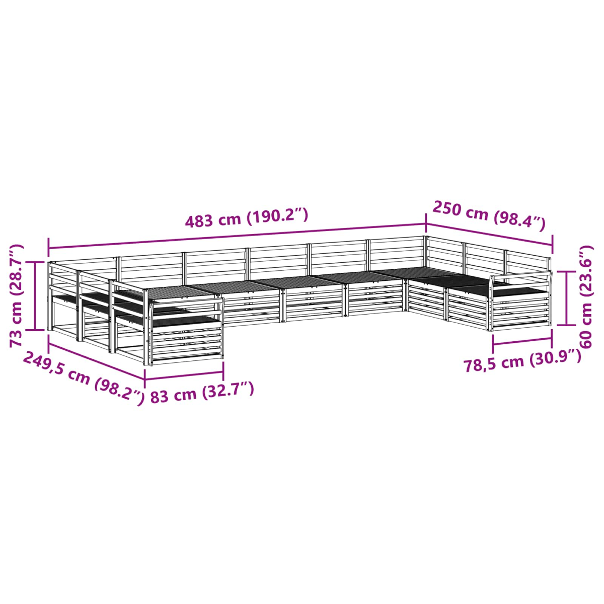 - Overall dimensions: 483 x 250 x 73 cm (L x W x H)