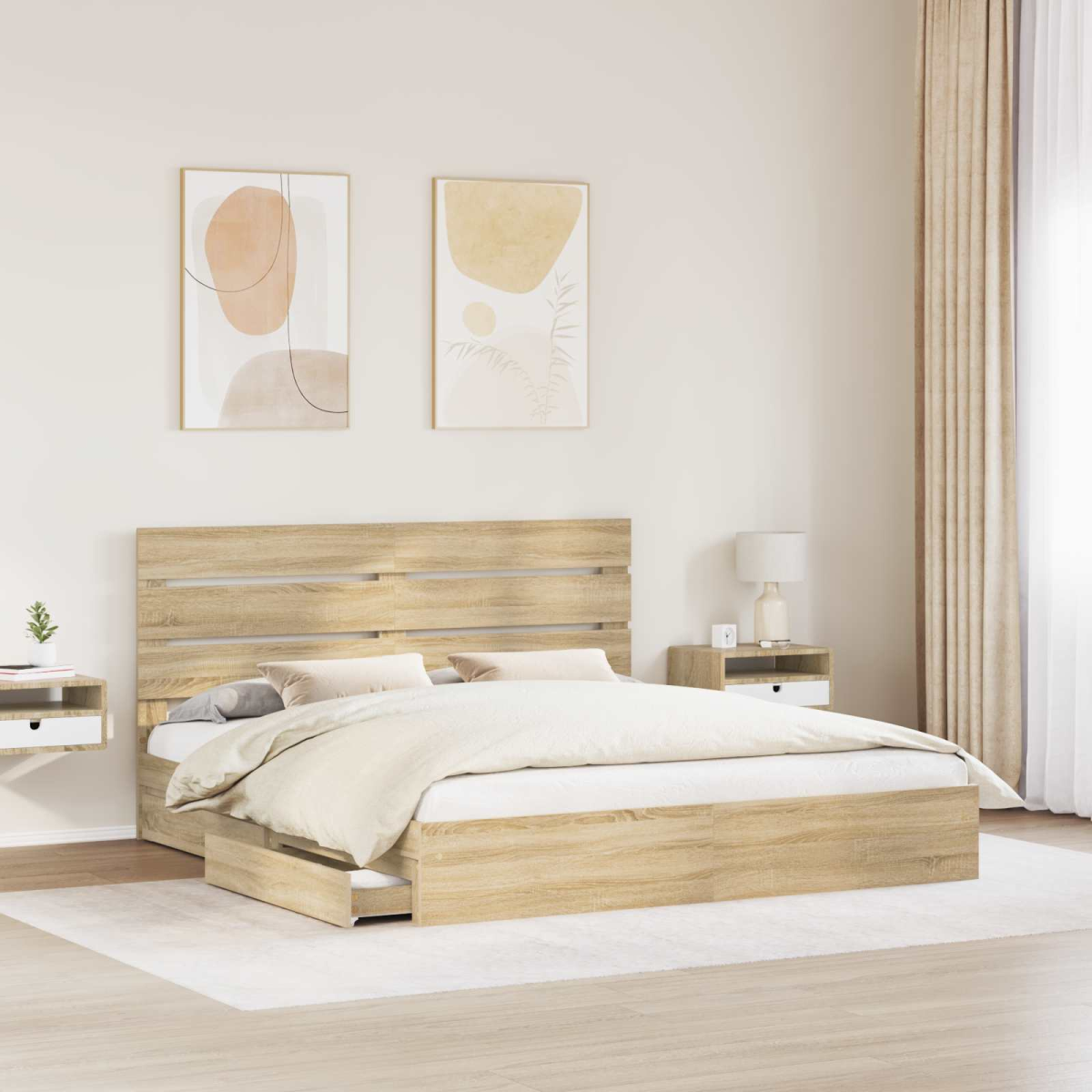 This storage bed frame epitomizes modern design through its sleek and minimalist aesthetic, providing a versatile solution for any bedroom. Crafted from engineered wood, it features smooth lines and unembellished surfaces that enhance the room's contemporary atmosphere. Designed for practicality and elegance, it offers ample storage options, making it a delightful addition for those who value functionality alongside style. Its durable construction ensures longevity, catering perfectly to urban dwellers seeking space optimization without compromising on style. Engineered Wood Construction This bed's framework is crafted from engineered wood, known for its structural integrity and ability to withstand daily use. The material gives the bed a clean and uniform appearance, perfectly aligning with the modern aesthetic. Resistant to wear and impacts, it remains sturdy over time, offering reliable support and an appealing centerpiece for any contemporary bedroom. Integrated Storage Drawers Featuring traditional drawer pulls, this bed integrates convenient storage solutions directly beneath the mattress. The drawers offer substantial space for storing linens, clothing, or other essentials, helping to keep the bedroom tidy and clutter-free. This practical design accommodates all bedroom necessities without taking up additional space, optimizing even the smallest of rooms effectively. Sleek Headboard Design Constructed from engineered wood, the headboard adds a touch of sophistication to the room's decor. Its unadorned surface maintains a minimalist appeal while providing comfortable back support for reading or lounging. Positioned to create a seamless aesthetic effect, it complements the entire bed frame's architecture harmoniously. User-Friendly Assembly Assembling this bed is straightforward, requiring just two individuals and a screwdriver, an inclusive manual guides step-by-step installation. This well-planned assembly process saves time and effort, ensuring that the bed quickly becomes the focal point of any bedroom without hassle. Simple Maintenance The bed's upkeep is facilitated by its easy-clean surface, which only requires a damp cloth for regular maintenance. This simple care routine helps maintain the frame's original allure, ensuring the bed remains a pristine addition to the bedroom over time.